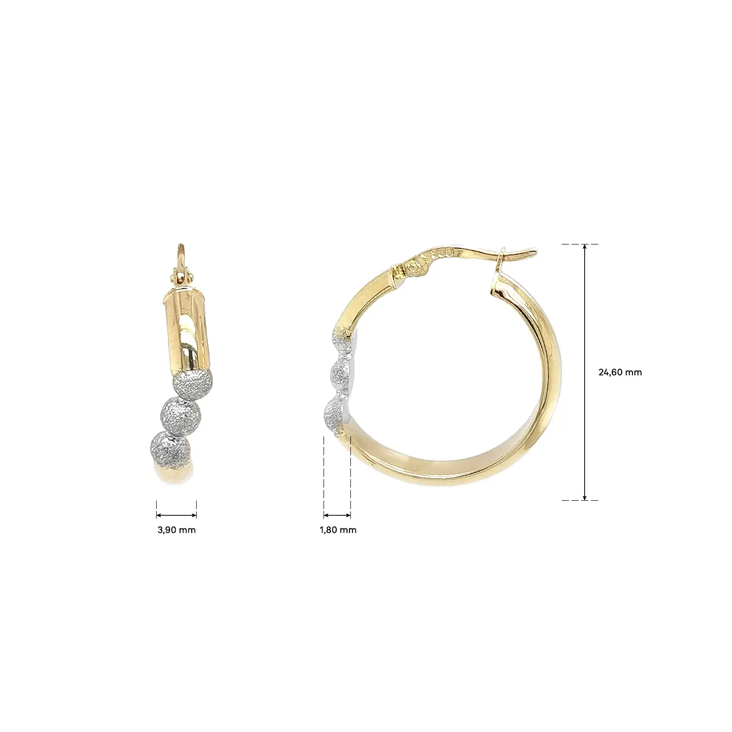 These elegant gold hoop earrings combine a polished yellow-gold surface with decorative matte white-gold half-spheres, creating a modern and feminine contrast. The 24.60 mm diameter offers a versatile size suitable for both everyday wear and special occasions. Detailed product description