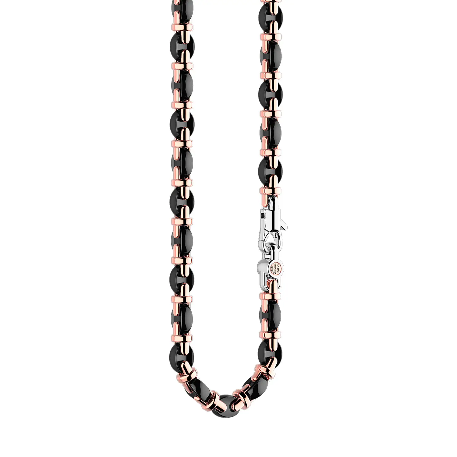 Zancan men’s chain with ceramic blends modern bicolor aesthetics with precise Italian craftsmanship. It stands out with 18kt gold (750/1000) in a white & rose bicolor finish and a polished surface, giving the piece a sophisticated, masculine look. With a 60 cm length, it feels balanced and wears well solo or layered with other accessories.