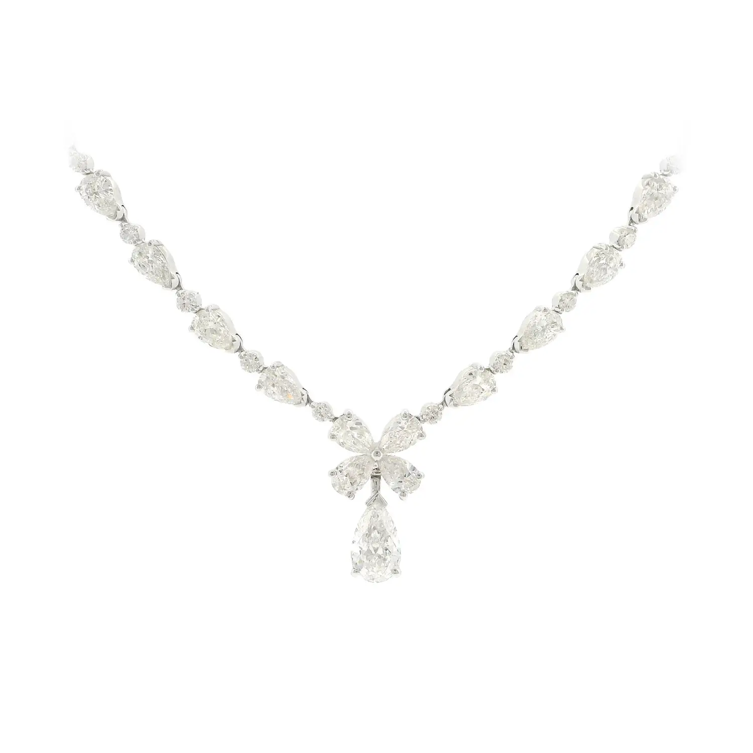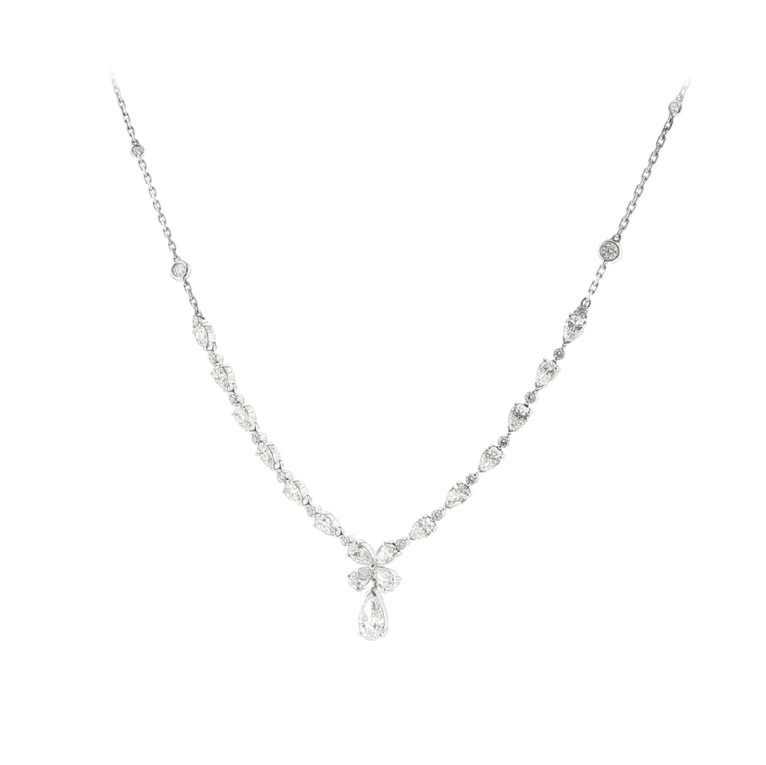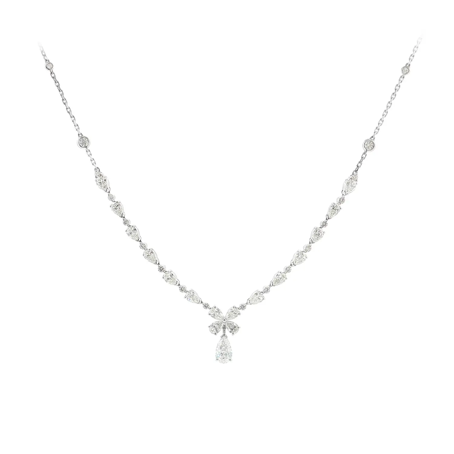At its heart shines a natural pear-shaped diamond of 0.70 ct, color F, and clarity VS — a true symbol of refined brilliance. Surrounding it are four additional pear-cut diamonds totaling 0.40 ct, and a magnificent arrangement of twelve larger pear-cut diamonds weighing 3.00 ct in D color and SI1 clarity. Completing the design are twelve round-cut accent diamonds (0.25 ct total), which enhance the necklace’s radiance and add depth to its overall sparkle.