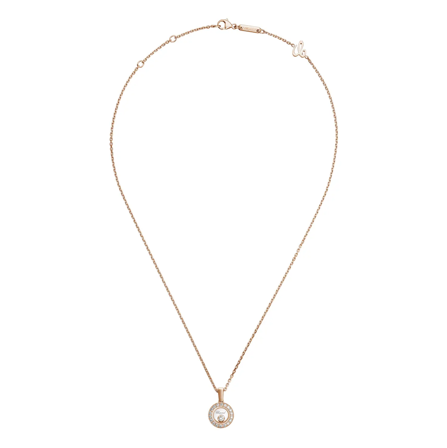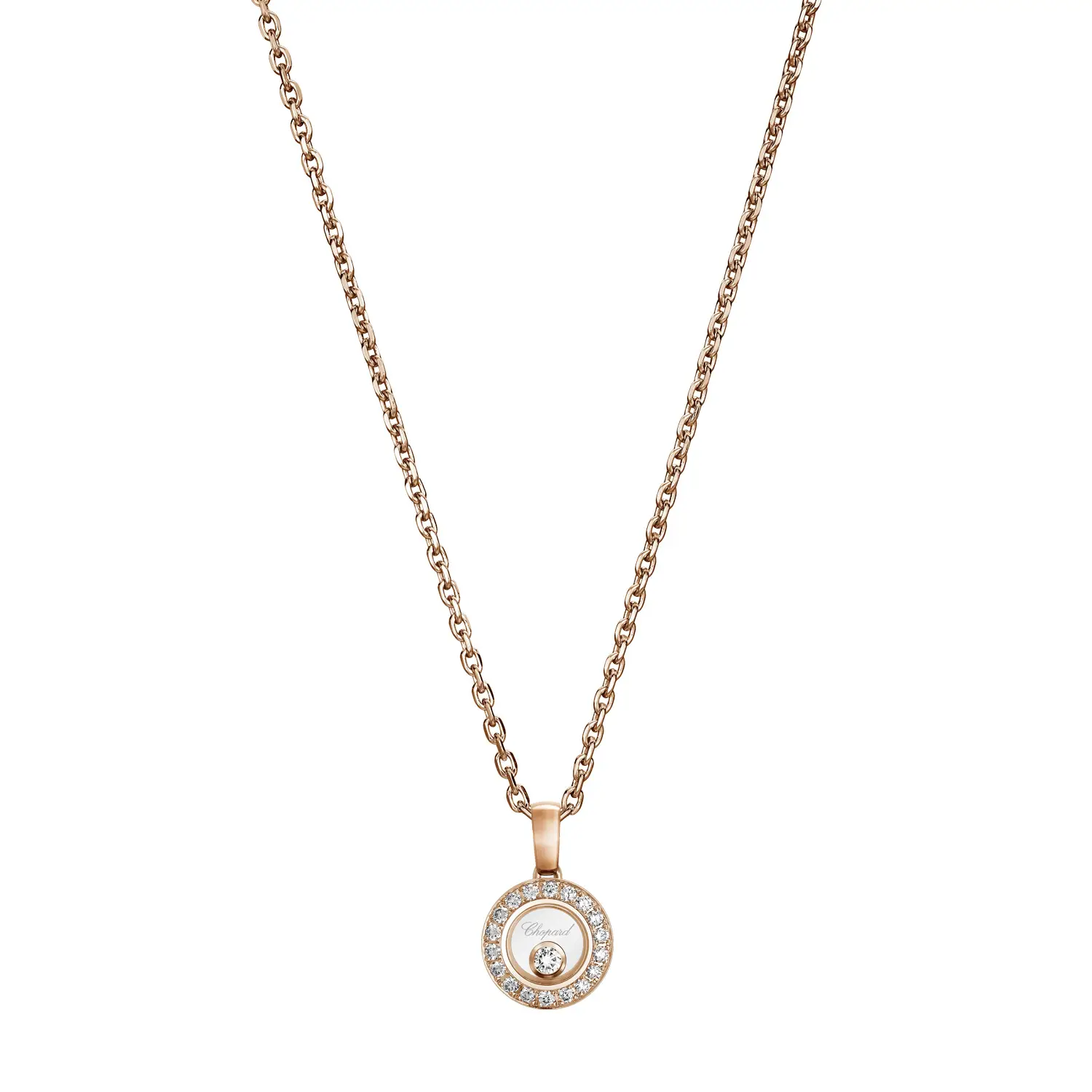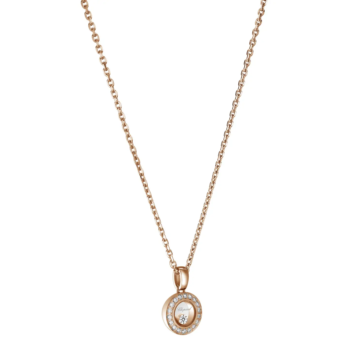 This elegant pendant from the Happy Diamonds Icons collection captures the perfect harmony between playfulness and sophistication. Crafted in 18 k rose gold, it features a freely moving diamond of approximately 0.19 ct encased between two sapphire crystals, symbolizing freedom, joy, and light – the core values of the Happy Diamonds universe.