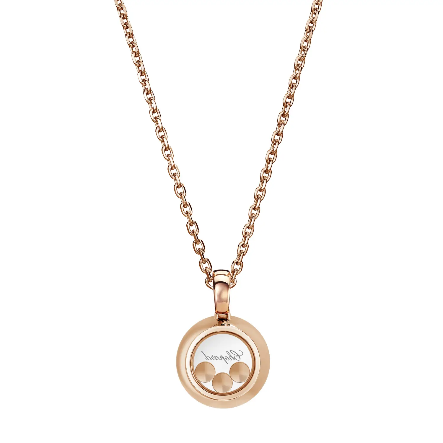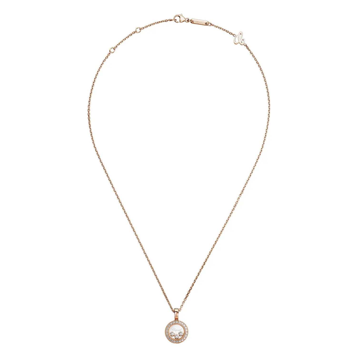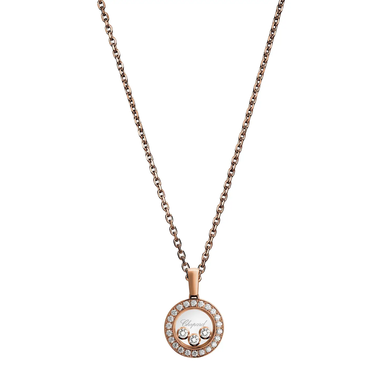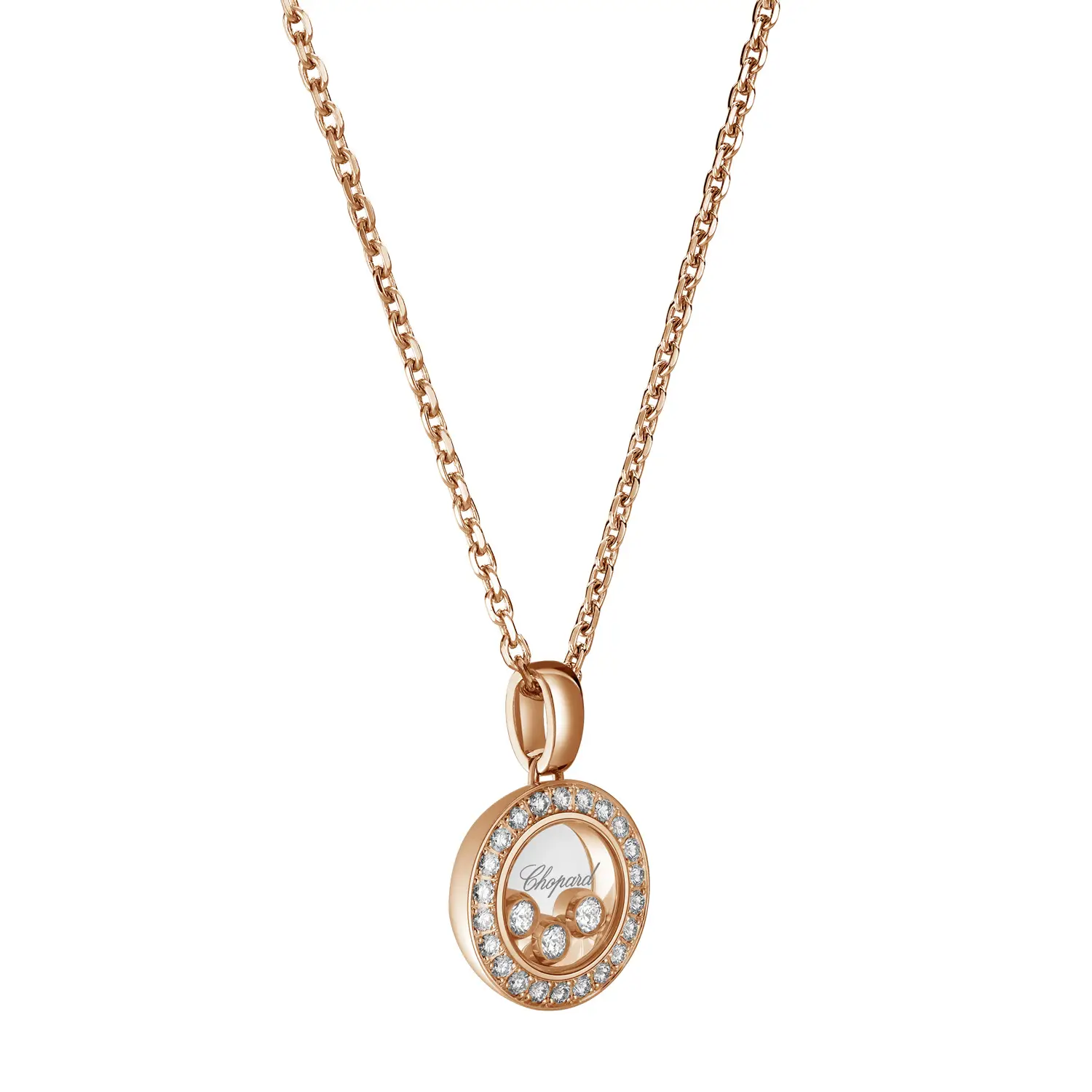 This charming pendant from the Happy Diamonds Icons collection symbolizes joy, freedom, and feminine grace. Crafted in 18 k rose gold, it features a freely moving diamond of approximately 0.05 ct encased between two sapphire crystals, creating a captivating play of light with every movement. The signature round shape engraved with the Chopard logo exudes modernity and timeless refinement.