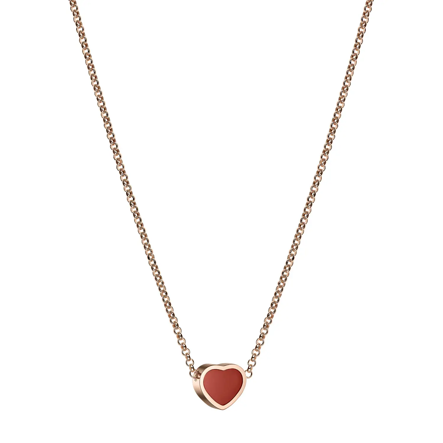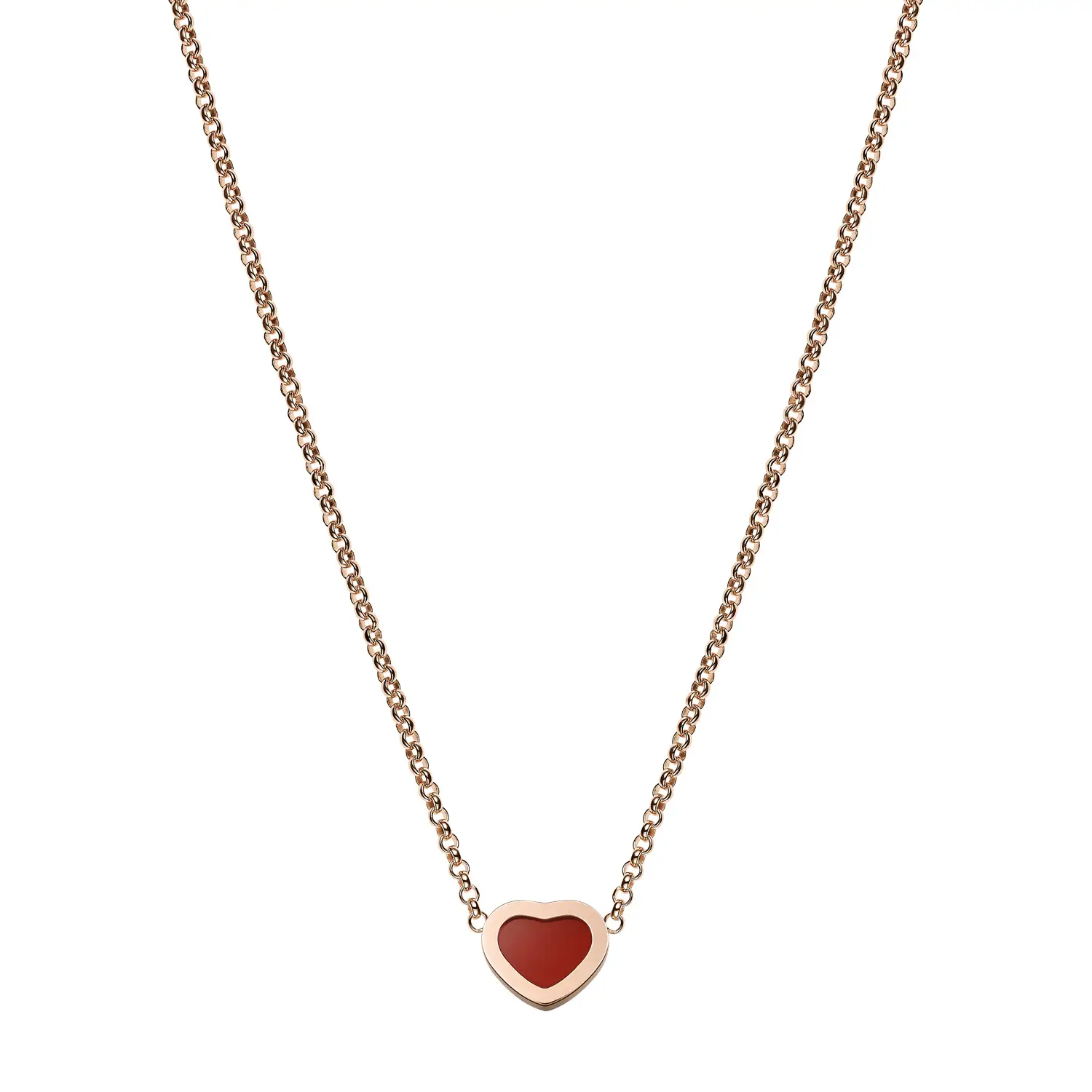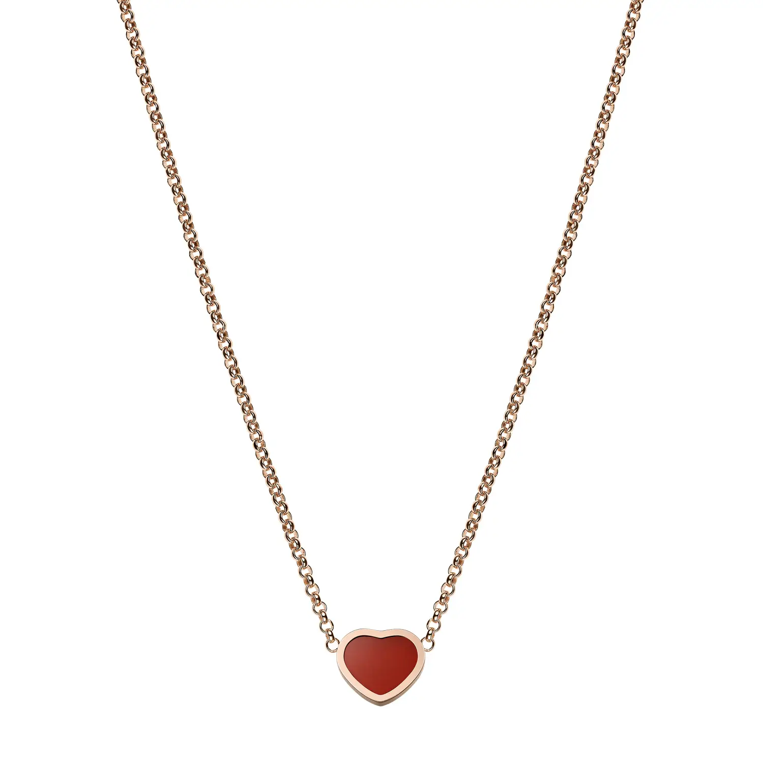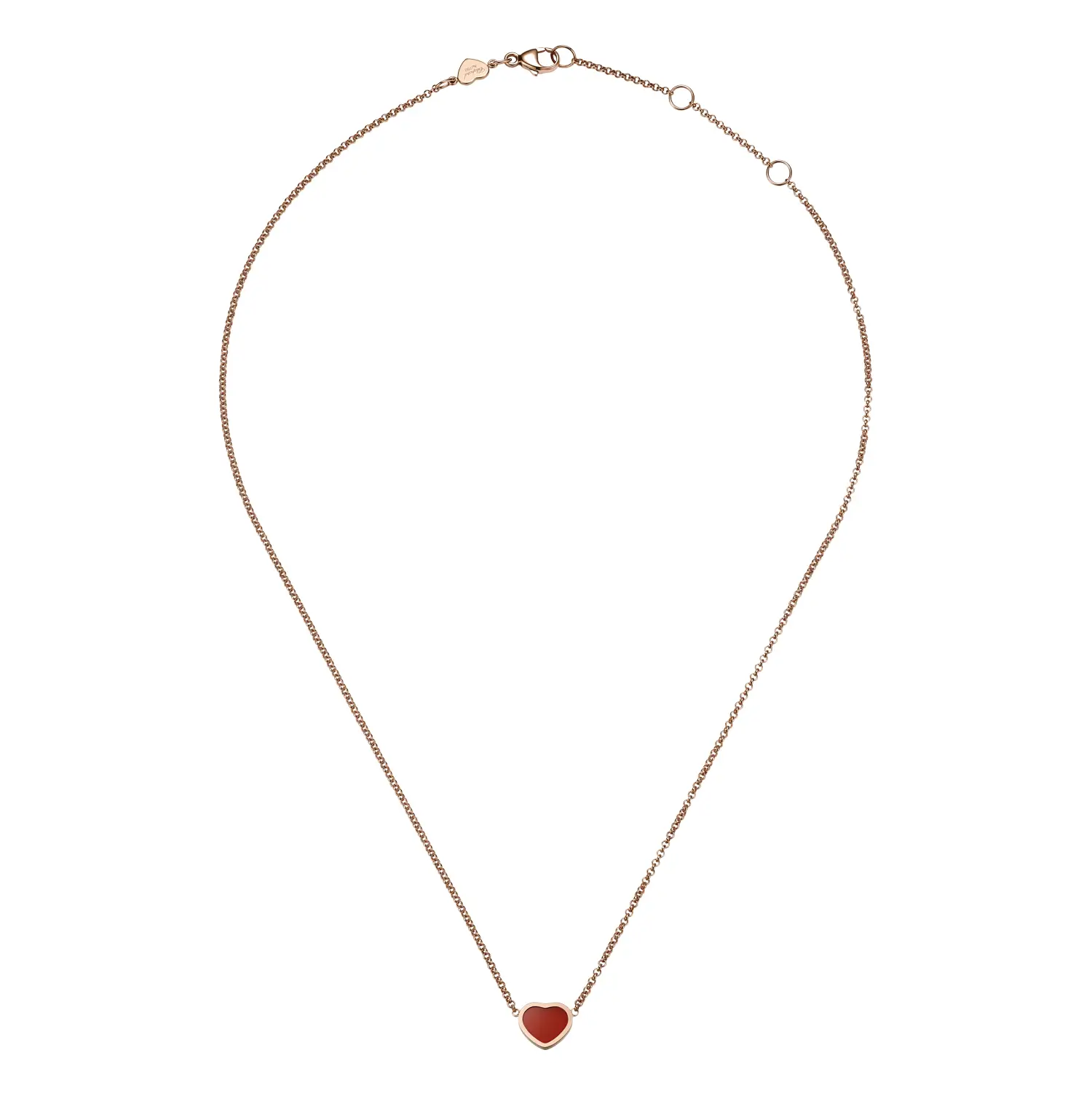 The Chopard My Happy Hearts 81A086-5801 necklace offers a refined and contemporary take on Chopard’s iconic design. Crafted from ethical 18-carat rose gold, it features a heart-shaped motif in red carnelian, a stone symbolizing passion, courage, and positive energy. Its minimalist elegance reflects the spirit of the My Happy Hearts collection — small symbols of happiness that tell personal stories.