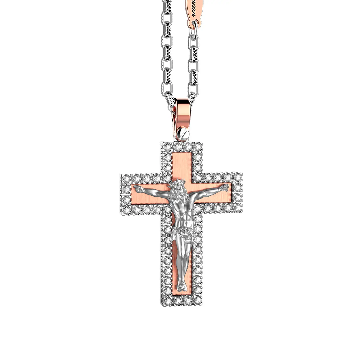 Zancan Couture EC901RB is a bold pendant that fuses modern design with a personal symbol of faith. Crafted in 18kt gold (750/1000) in a bicolor mix of white & rose with a refined polished / matte contrast, it features a cross motif (religious) and is worn on a 60 cm chain—ideal for everyday wear and special moments.