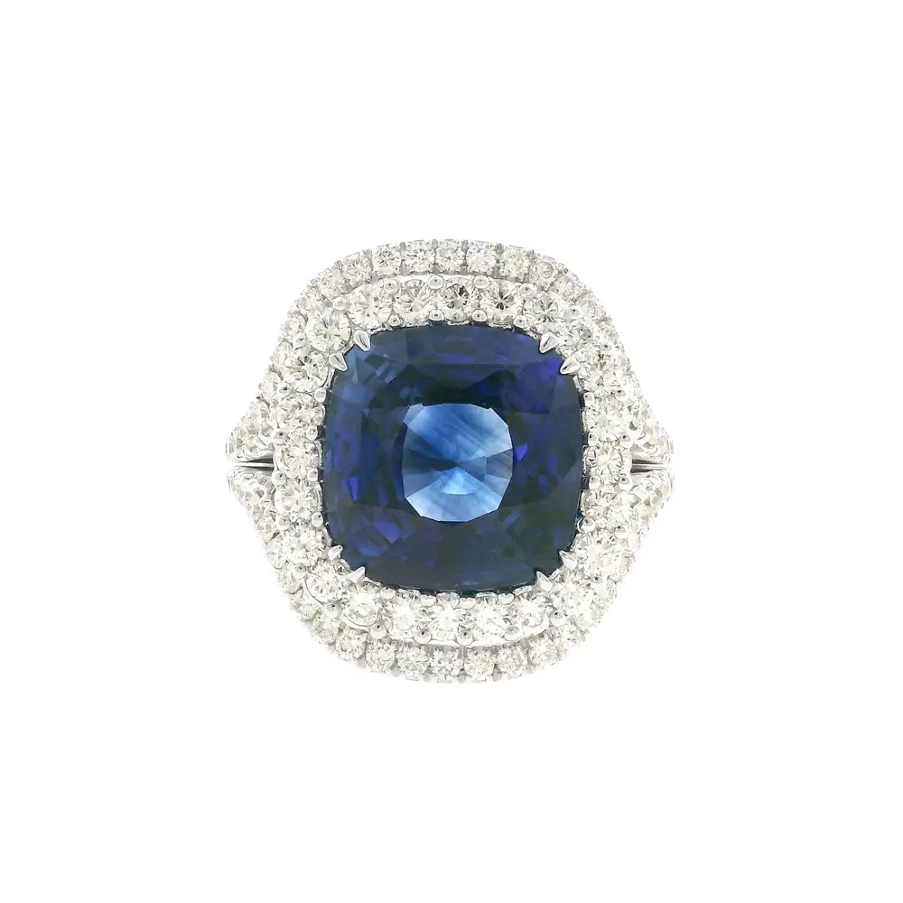 At the center is a natural sapphire, 7.67 ct (1 pc) in cushion cut (11.35 × 11.05 mm), deep blue. Sparkle and contrast come from pavé-set natural diamonds, 1.29 ct (88 pcs), round cut (1.70–2.30 mm), white, SI clarity, G color. The precise setting highlights both the sapphire’s depth and the diamonds’ brilliance—yielding a luxurious, striking, and timeless ring destined to be the centerpiece of your jewelry collection.