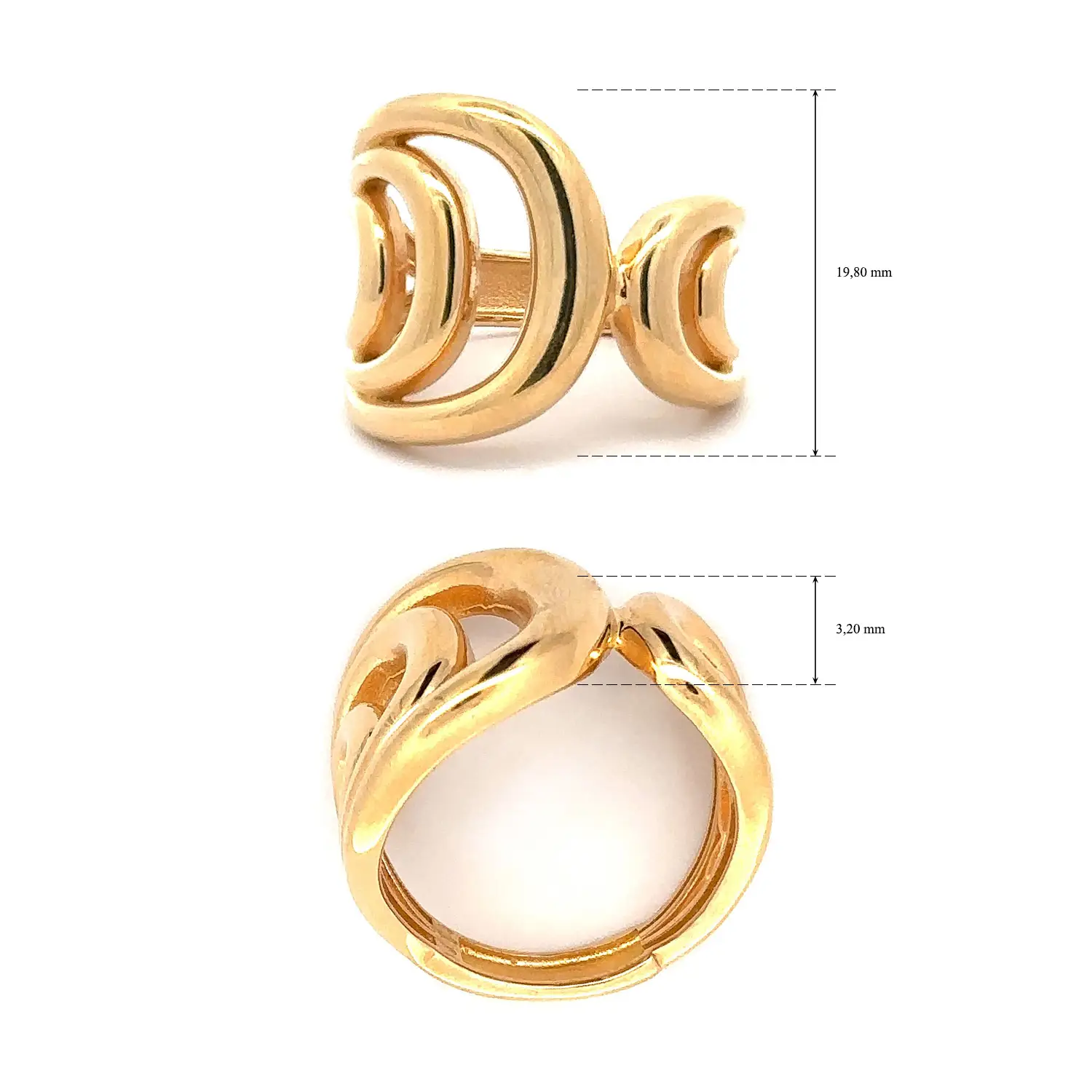 This distinctive ring captivates with its open, organic design, crafted from gracefully flowing curves and a sculptural modern aesthetic. Two elegant, wave-like lines wrap softly around the finger, creating a dynamic yet harmonious structure that feels both delicate and expressive. The high-polished yellow gold enhances the piece with luxurious depth and a sophisticated visual impact.