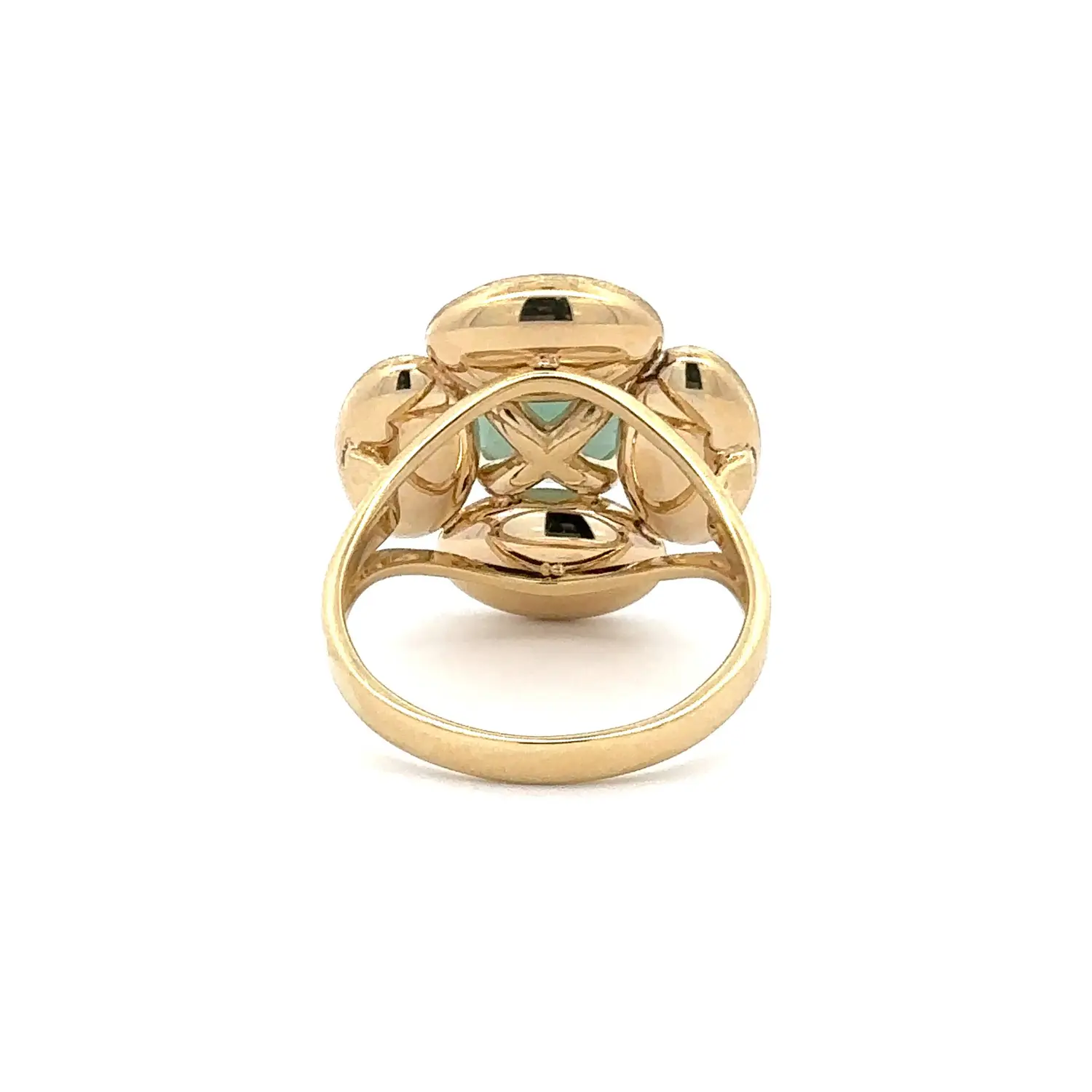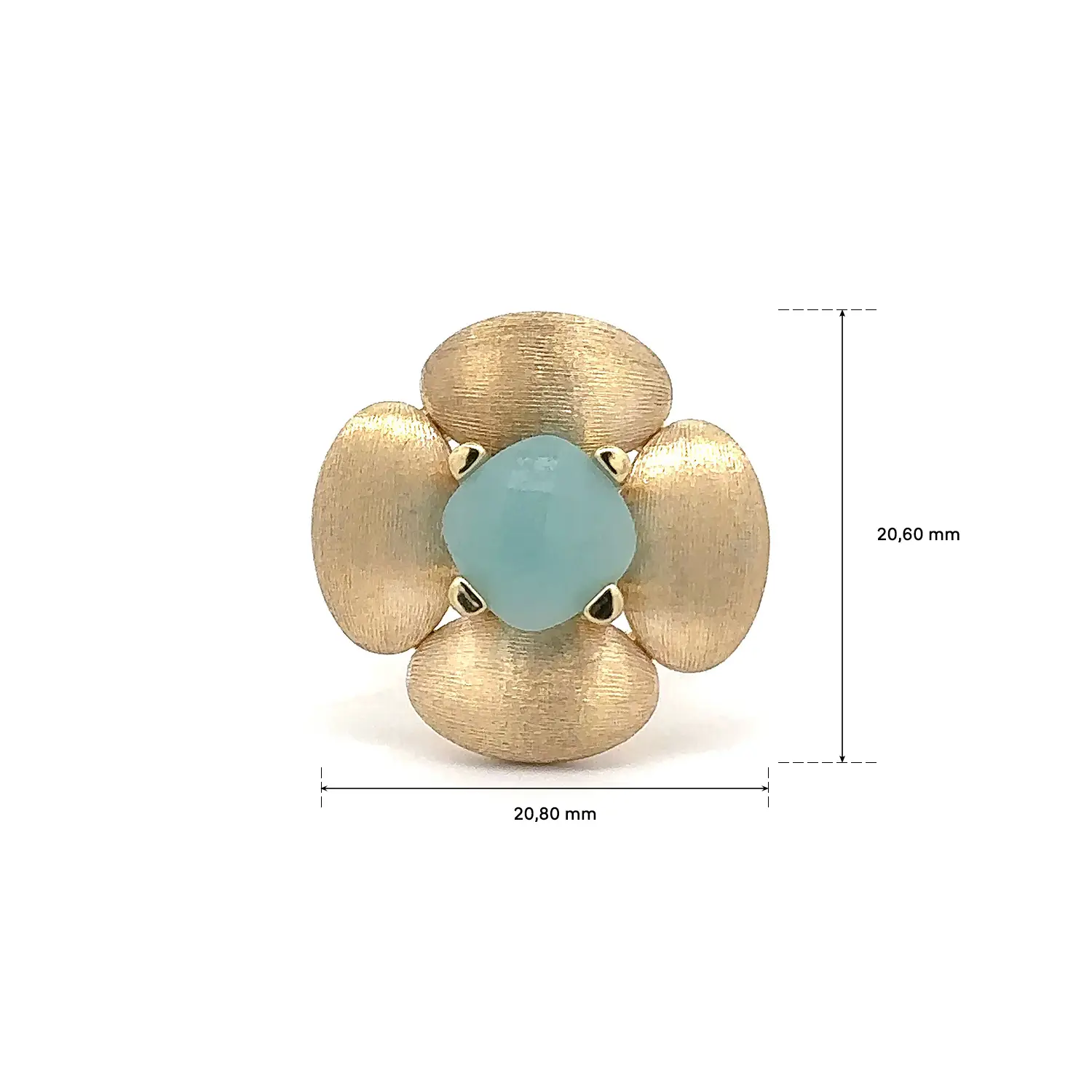 This expressive ring captivates with its sculptural floral motif, centered around a light blue cushion-cut aquamarine. Four oval, softly matte-finished petals crafted from 14k yellow gold form an elegant flower that gives the piece depth, volume, and an artistic contemporary character. The contrast between the pastel gemstone and the textured gold surface creates a beautifully balanced, refined aesthetic.