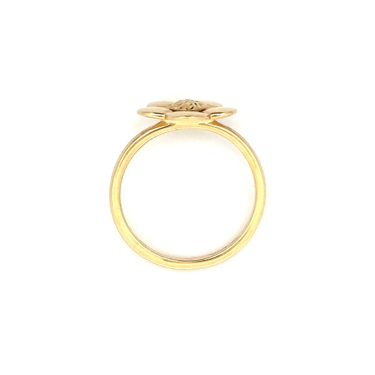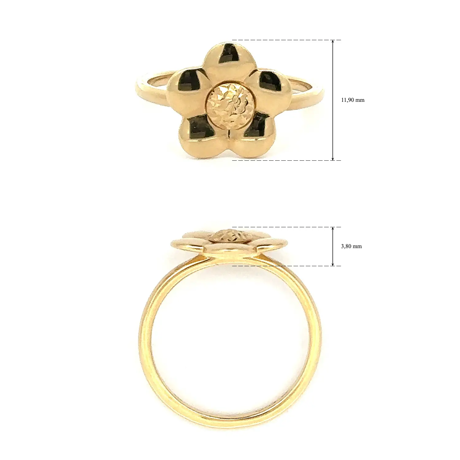 This elegant ring in the shape of a delicate stylised flower captures a joyful, playful character expressed through a clean and refined design. The polished gold creates a harmonious silhouette of five rounded petals, while the centre is decorated with a textured detail that adds gentle depth and luminous reflections. With its minimalist yet captivating form, the ring feels youthful, optimistic, and light.