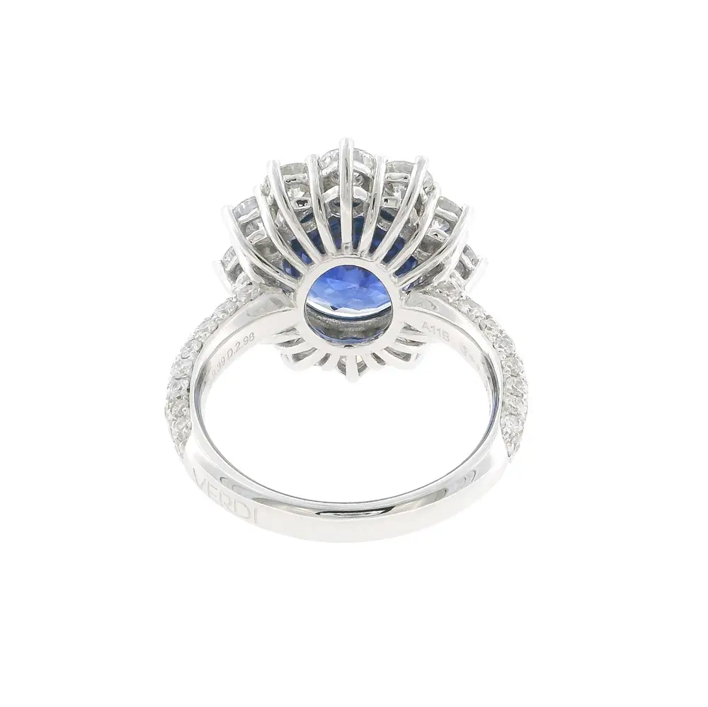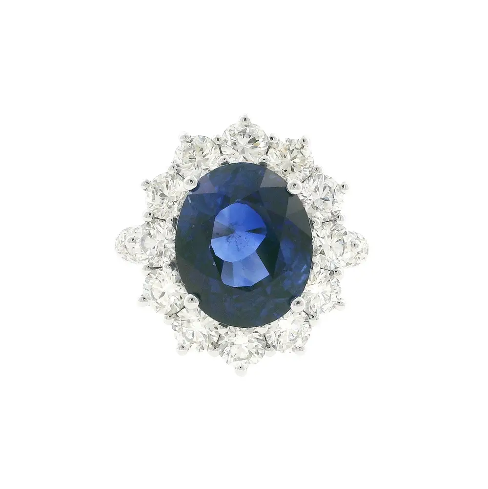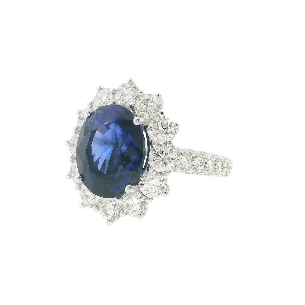 At its heart lies a captivating natural sapphire weighing 8.39 ct, displaying a deep royal blue hue in a refined oval cut (12.45 × 10.40 mm). Surrounding it are 44 natural diamonds totalling 2.98 ct (2.00–3.80 mm, colour G, clarity VS), creating a radiant halo that reflects light with magnificent brilliance.