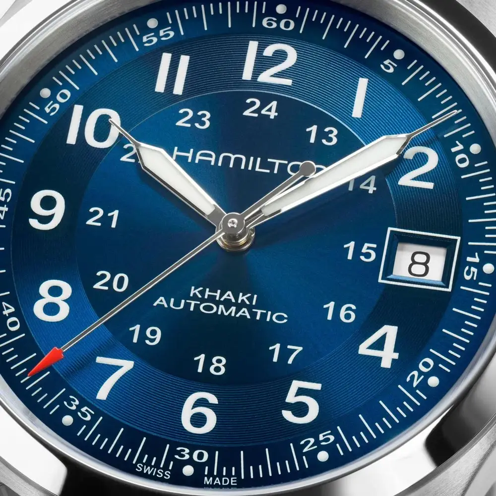 The Hamilton Khaki Field Auto H70455540 blends military heritage with modern precision and everyday versatility. Its compact 38 mm stainless-steel case frames a blue sunburst dial with bold hands and indexes for excellent readability, complemented by a practical date display and 24-hour scale. With its combination of iconic field-watch styling and refined execution, this model fits seamlessly into both urban daily wear and more active outdoor days. Detailed product description