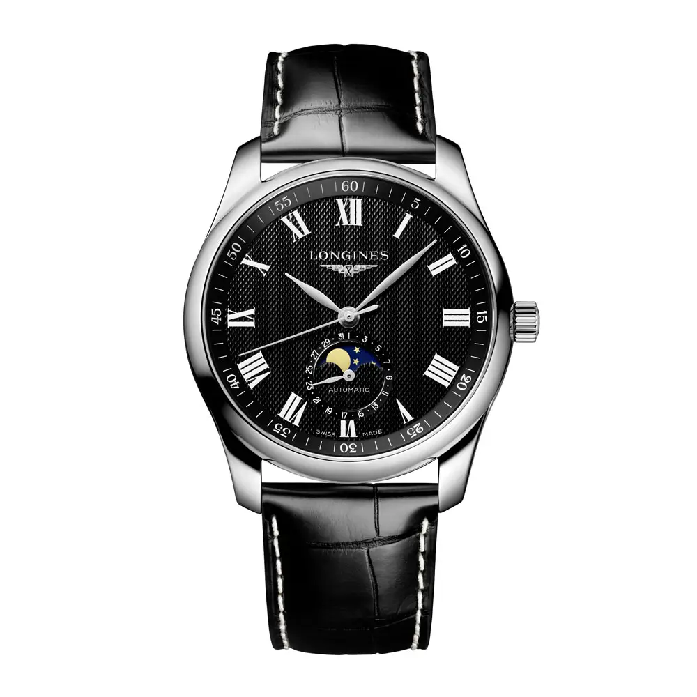 Longines Master Collection L2.909.4.51.7 is a sophisticated automatic model with a moonphase complication, blending Swiss watchmaking tradition with modern style. The 40 mm stainless steel case is protected by a sapphire crystal and paired with a black alligator strap with triple-safety clasp.