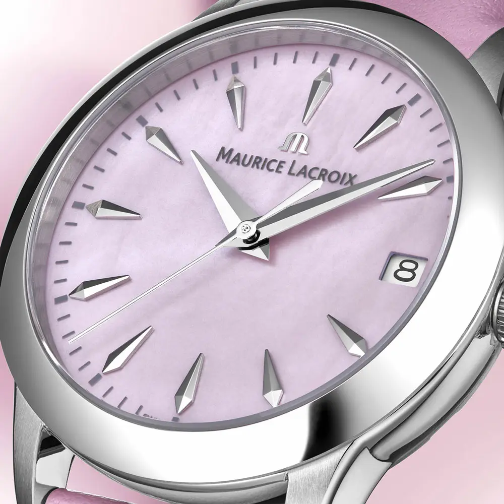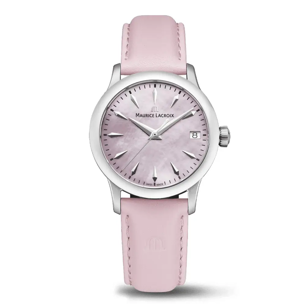 The watch is paired with a pink leather strap with a classic pin buckle and a quick-change system for easy strap replacement. With 100 m water resistance, it is suitable for everyday wear as well as occasional contact with water. The Maurice Lacroix 1975 collection represents a perfect blend of elegance, Swiss quality, and timeless style.