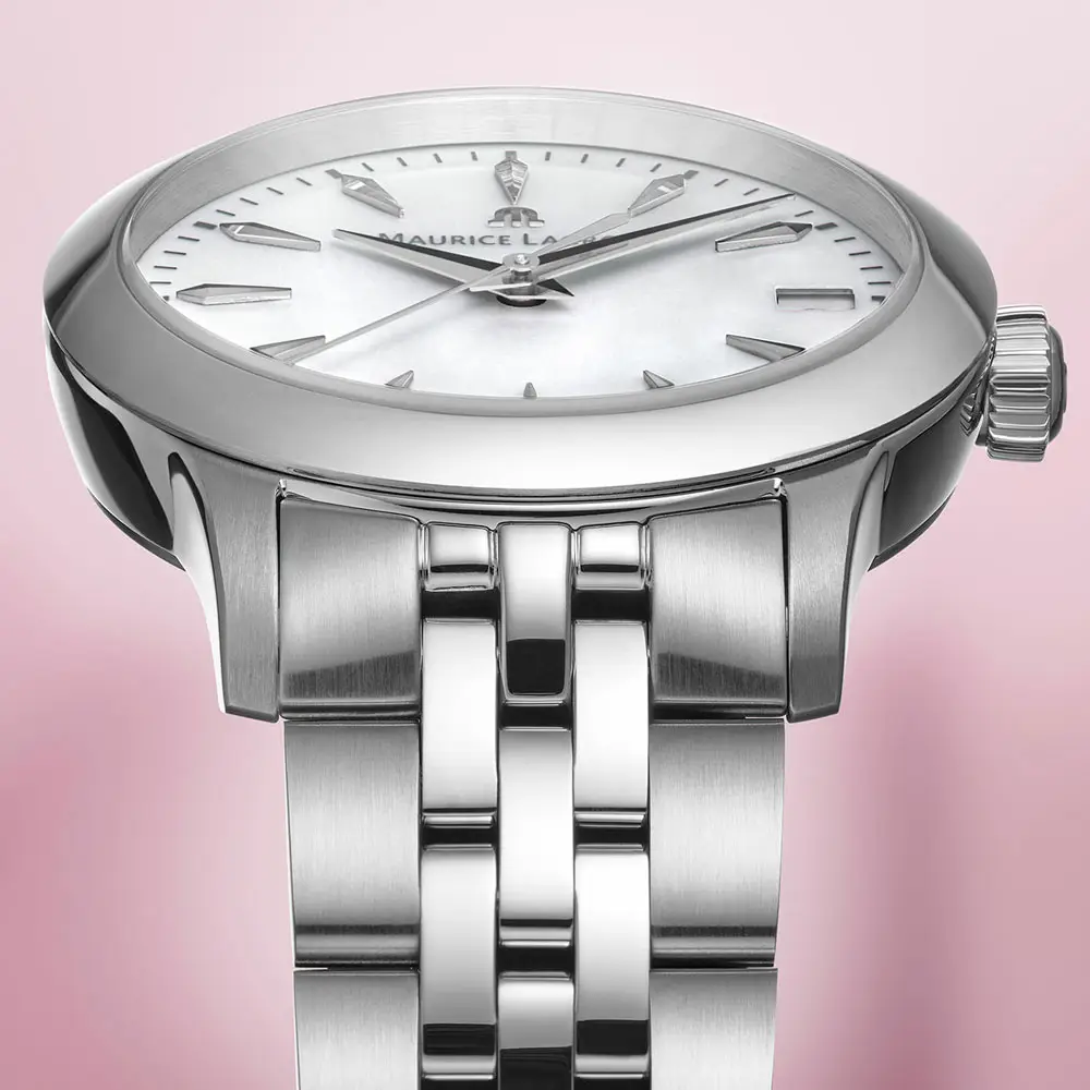 The Maurice Lacroix 1975 Quartz 33 mm (751006-SS002-160-1) ladies’ watch combines Swiss precision with timeless elegance. The 33 mm stainless steel case with polished and brushed surfaces gives the watch a refined appearance and makes it ideal for slimmer wrists. The model features a delicate white mother-of-pearl dial, complemented by rhodium-plated hands and hour markers for excellent readability. Detailed product description