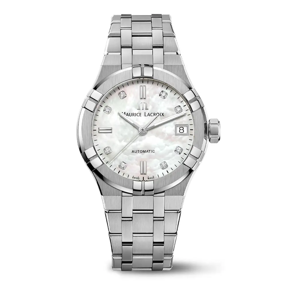The Maurice Lacroix Aikon Automatic Ladies 35mm (ref. AI6006-SS002-170-1) embodies elegance, technical precision, and contemporary Swiss design. Its 35 mm stainless steel case fits perfectly on the wrist and combines polished and brushed surfaces for a refined, luxurious appearance.