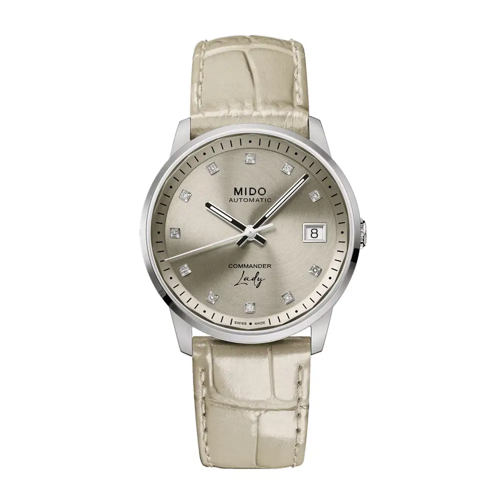 The Mido Commander Lady is an elegant model designed for modern women who appreciate the combination of refined design and Swiss precision. Its classic round case with a diameter of 35 mm is made of high-quality stainless steel and protected by a durable sapphire crystal, ensuring perfect legibility and scratch resistance.