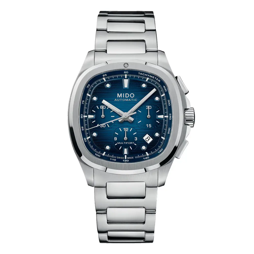 The Mido Multifort TV Chronograph M049.527.11.041.00 presents the iconic 'TV-shaped' design in an elegant stainless steel finish. The 41.2 mm × 42 mm case with a thickness of 14.3 mm is complemented by a sapphire crystal with double-sided anti-reflective treatment and a screw-down crown for added durability. The blue gradient dial with tachymetric scale, two sub-dials and distinctive date offers great legibility, while water resistance to 100m ensures reliability in everyday wear.