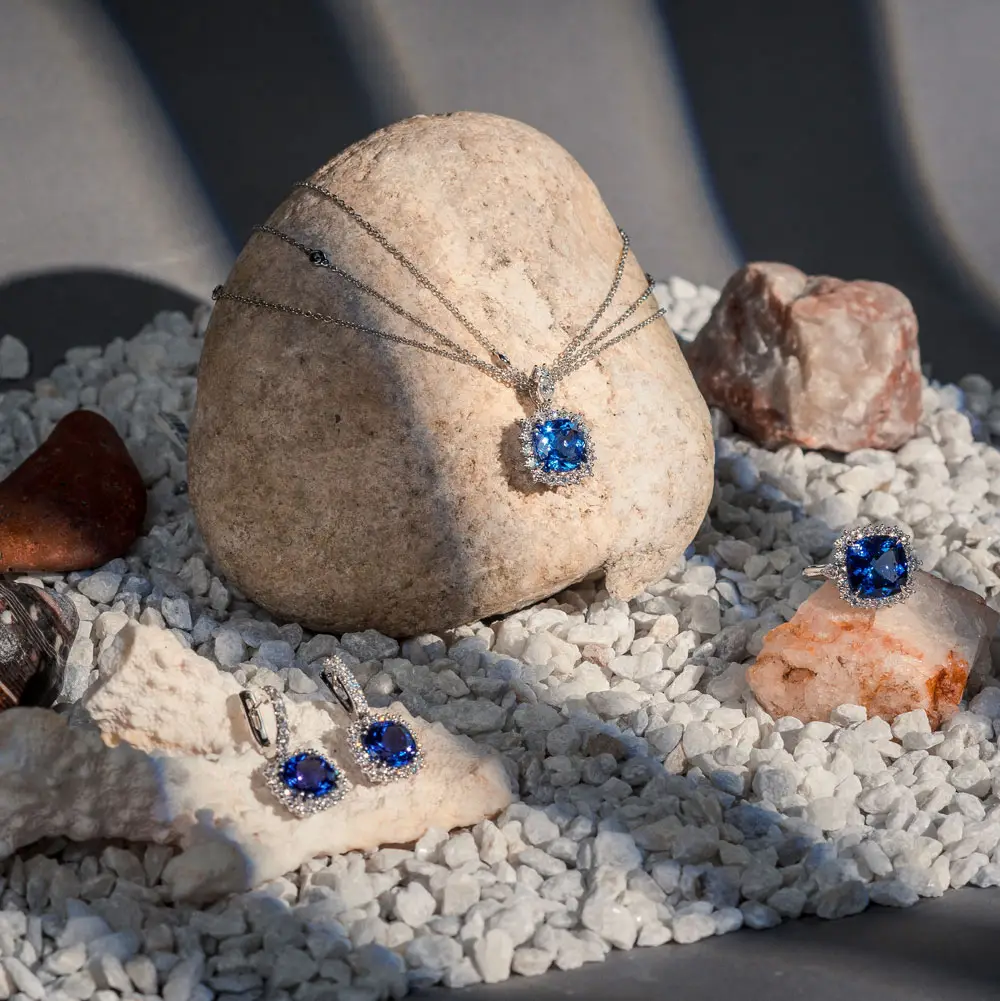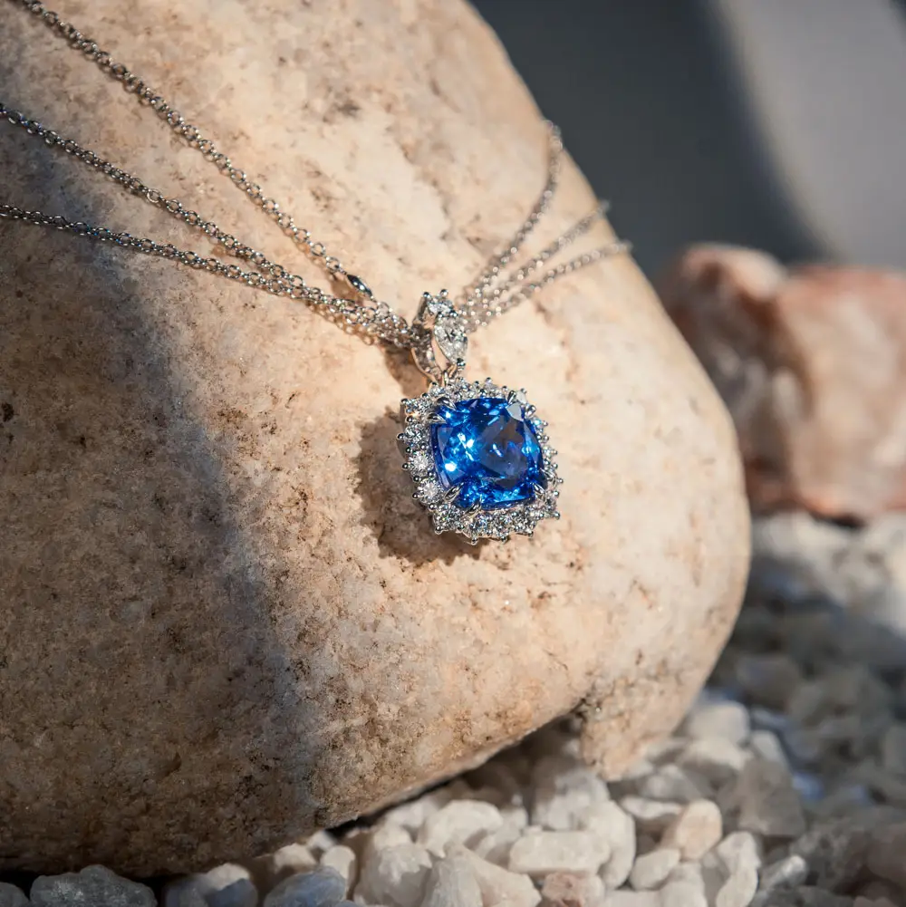 At its center lies a natural tanzanite weighing 6.52 ct, cushion cut (10.30 × 10.30 mm), whose blue-violet tone evokes serenity and oceanic depth. It is surrounded by 24 natural white diamonds totalling 1.12 ct, colour G, clarity VS, forming a radiant halo that enhances the gemstone’s mesmerizing hue.