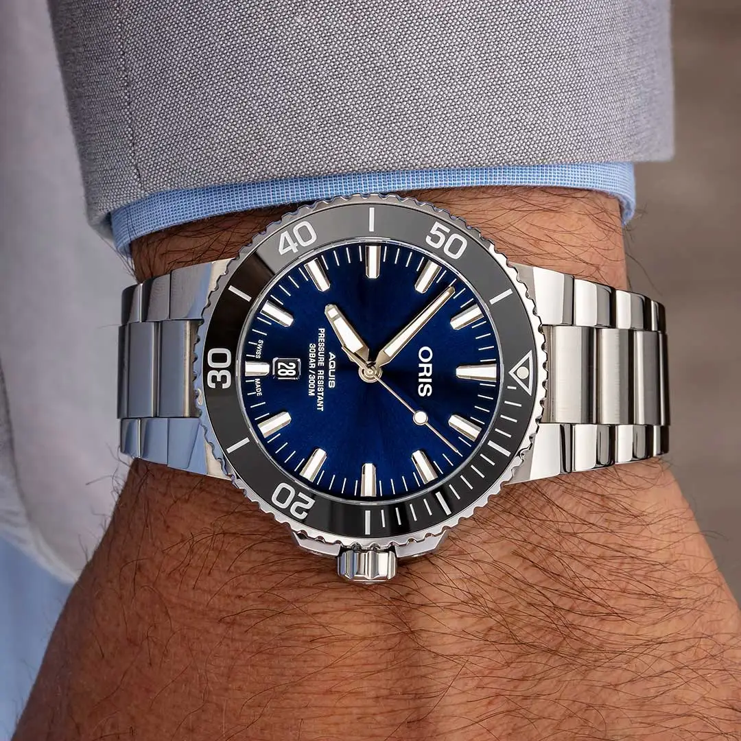 Oris Aquis is the brand's flagship diving collection that combines functionality, rugged construction and modern design. Designed for true underwater deployment, the Aquis collection offers water resistance up to 300 metres, a screw-down crown, unidirectional lunette and high resistance to shock and pressure.