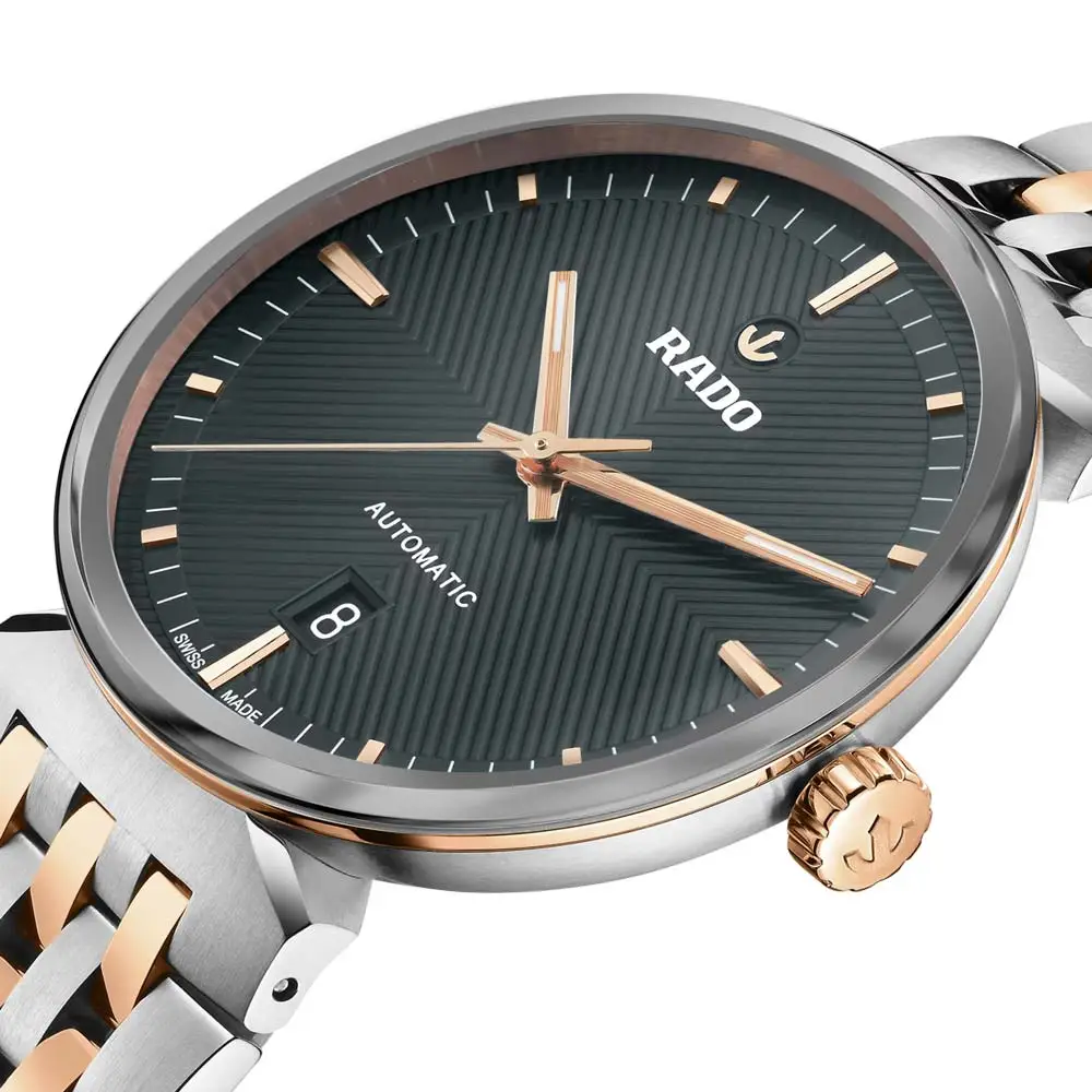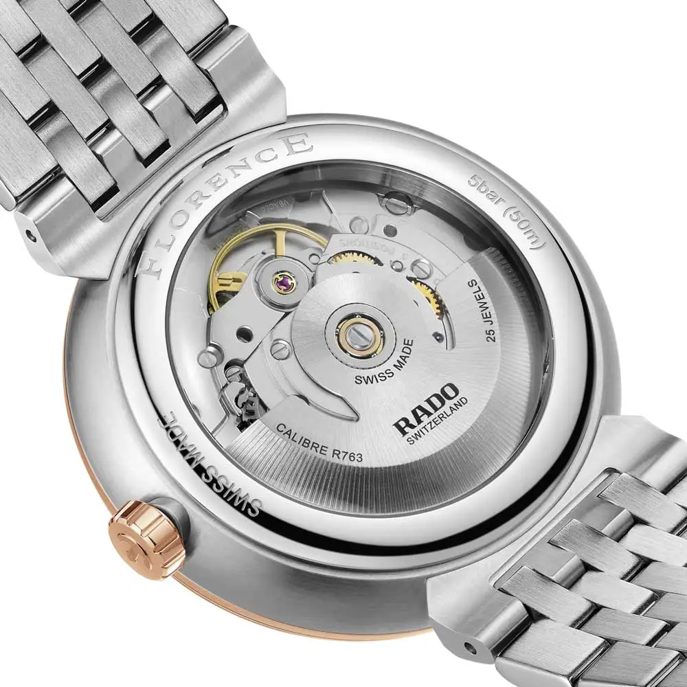 The Rado Florence Automatic R48903103 brings the elegance of classic design into a modern interpretation, characteristic of the Florence collection. The 39 mm round case is made of high-quality stainless steel with rose gold-tone accents, giving the watch a timeless and luxurious look.