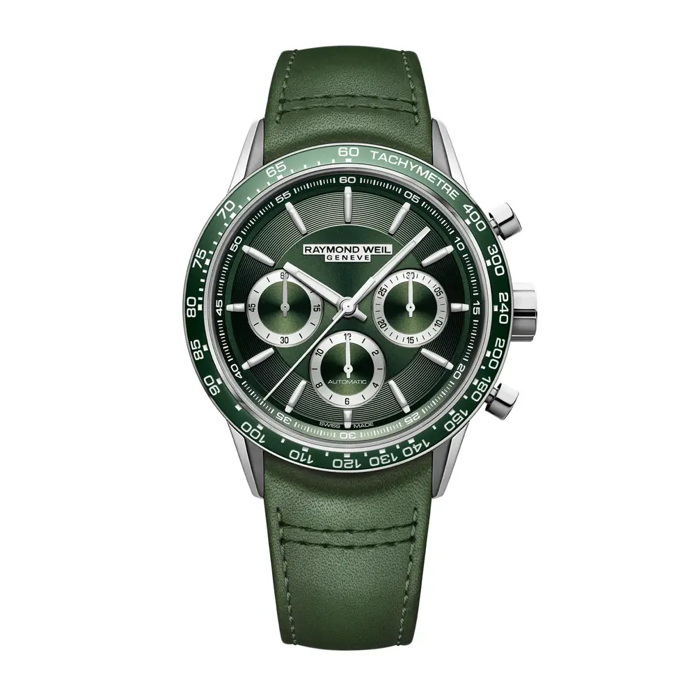 The Raymond Weil Freelancer 7741-SC7-52021 is a sophisticated men’s chronograph that seamlessly blends elegance, technical precision, and sporty spirit. As part of the iconic Freelancer collection, it stands out with its striking green design and Swiss-made craftsmanship, perfectly suited for the modern gentleman.