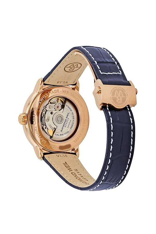 A luxury men's watch in blue-gold colours that will make you stand out in society. At its heart is a mechanical movement that harks back to the long tradition of Raymond Weil watchmaking. The analogue dial is decorated with Roman numerals and rose-gilt hands that match the colour of the case. Made to impress.