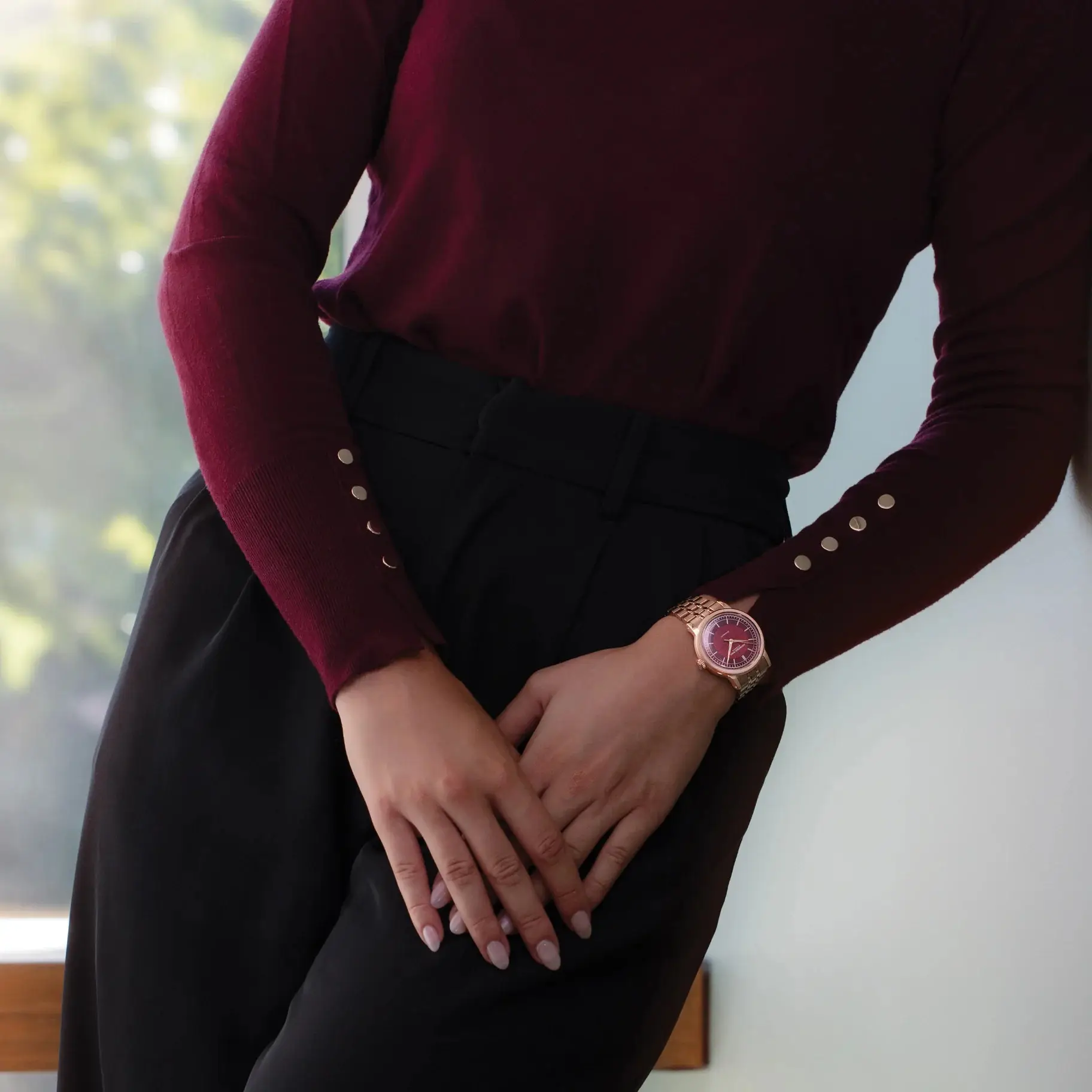 The standout feature is the deep burgundy analog dial, adding depth and sophistication to the overall design. Inside beats the RW4200 automatic mechanical movement, offering a power reserve of approximately 41 hours, known for its accuracy and reliability.