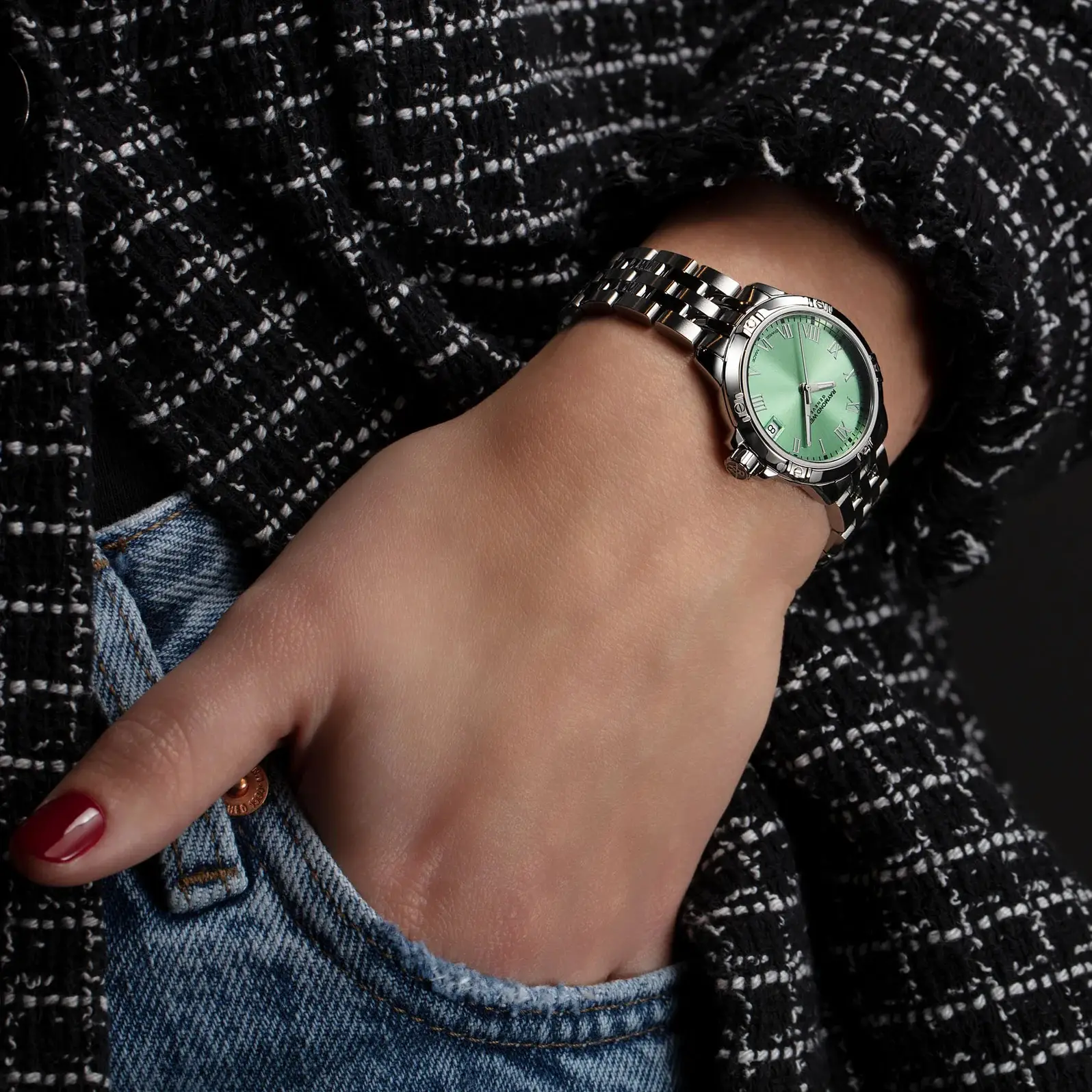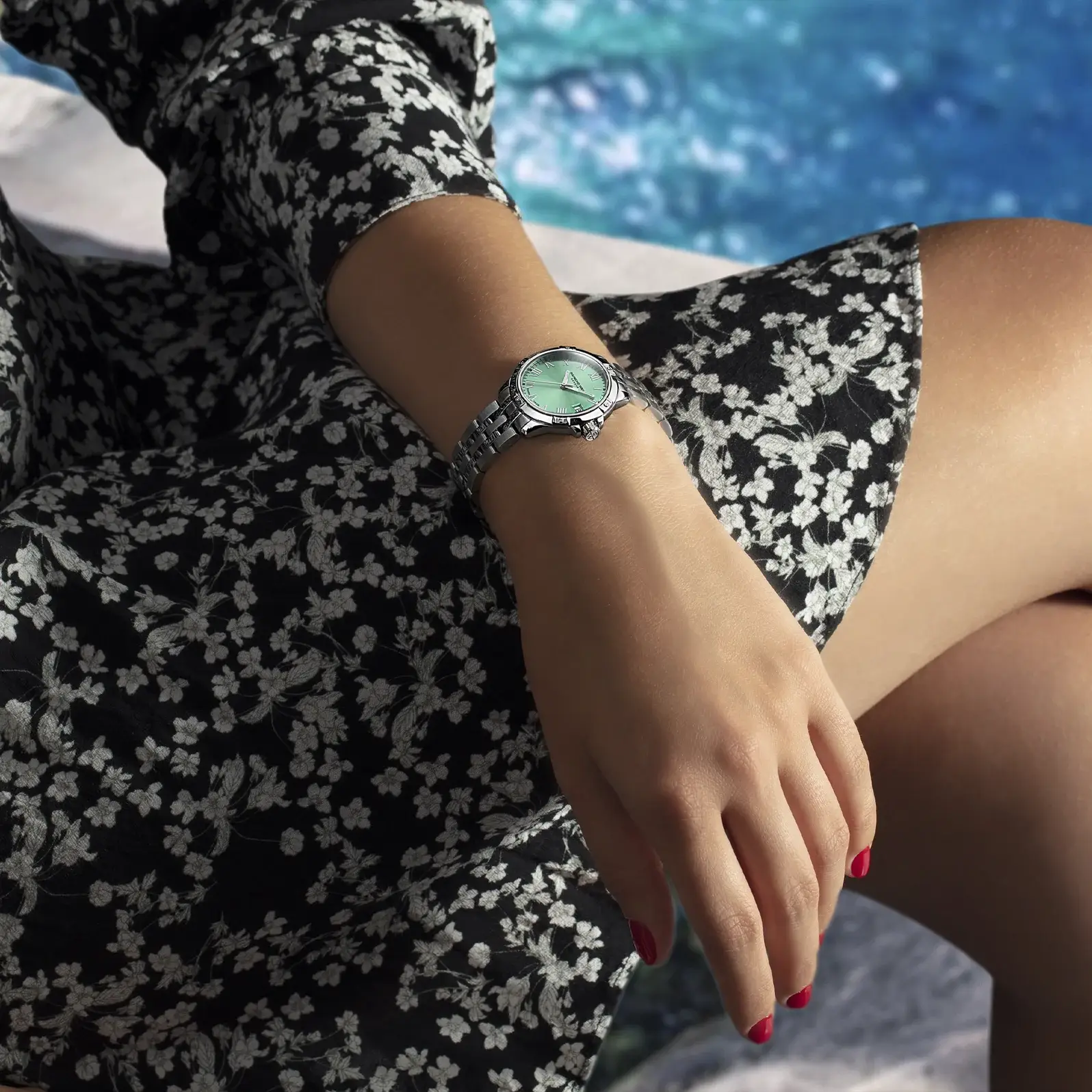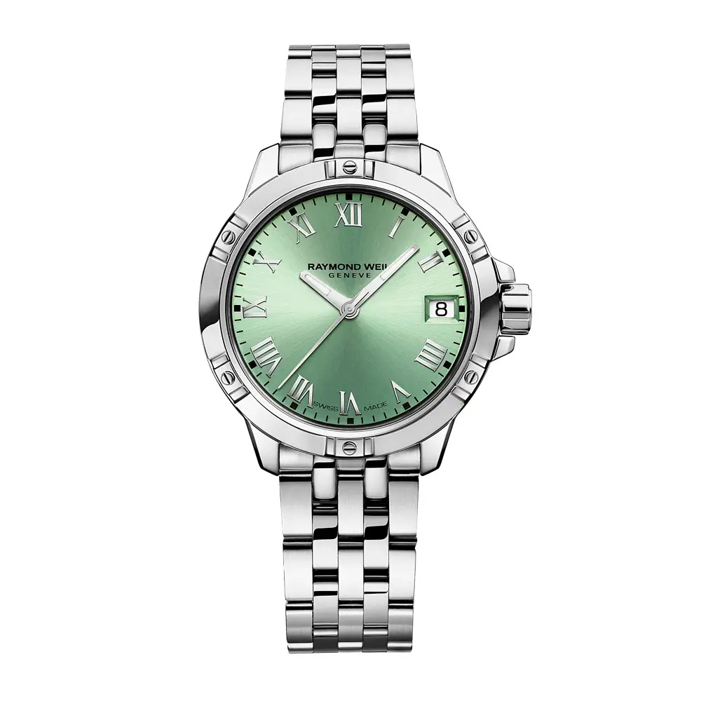 The Raymond Weil Tango 5960-ST-00520 combines elegant design, refined details, and Swiss precision. The 30 mm stainless steel case is protected by a scratch-resistant sapphire crystal, while the light green sunray dial features Roman numerals, luminous hands, and a date window at 3 o’clock, blending practicality with timeless elegance.