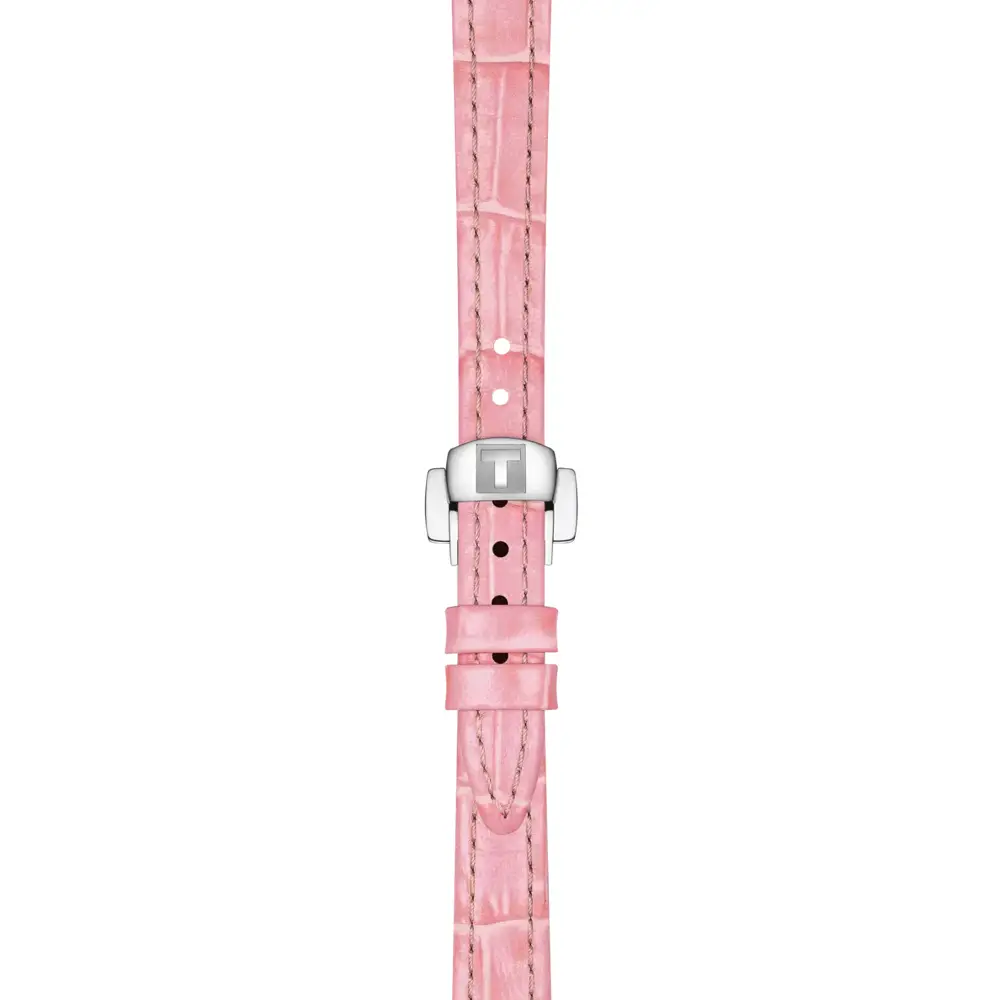 The Tissot Bellissima Small Lady T126.010.16.013.01 combines refined elegance with timeless Swiss craftsmanship. Its 26 mm round stainless steel case is paired with a delicate pink leather strap for a feminine and stylish look. The clean white dial with Roman numerals and a date display offers both charm and practicality.