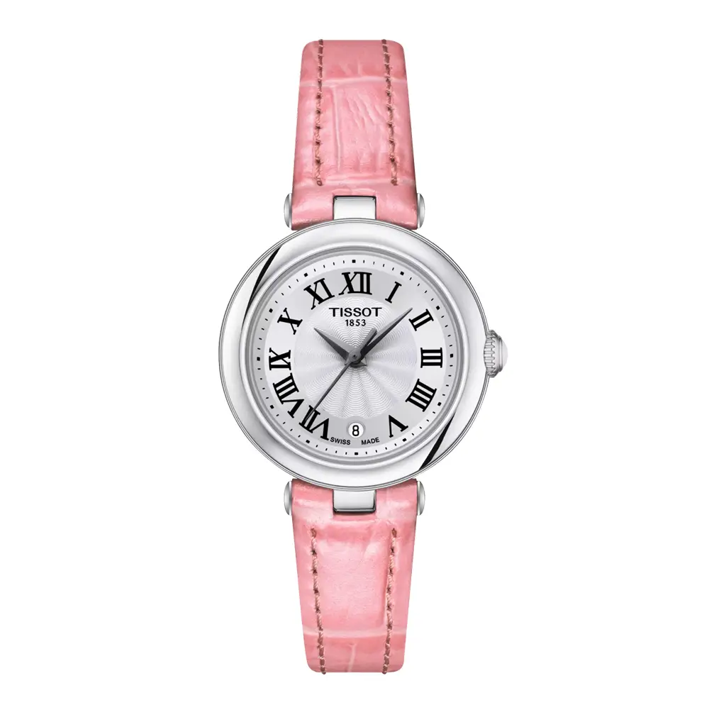 The Tissot Bellissima Small Lady T126.010.16.013.01 combines refined elegance with timeless Swiss craftsmanship. Its 26 mm round stainless steel case is paired with a delicate pink leather strap for a feminine and stylish look. The clean white dial with Roman numerals and a date display offers both charm and practicality. Detailed product description