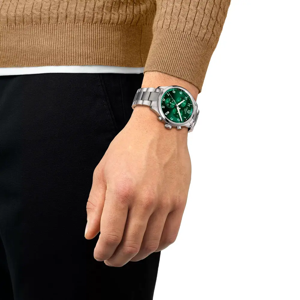 The striking green analog dial with contrasting indexes and a date display offers a modern yet timeless look. The watch is also equipped with a practical chronograph, perfect for precise time measurement.