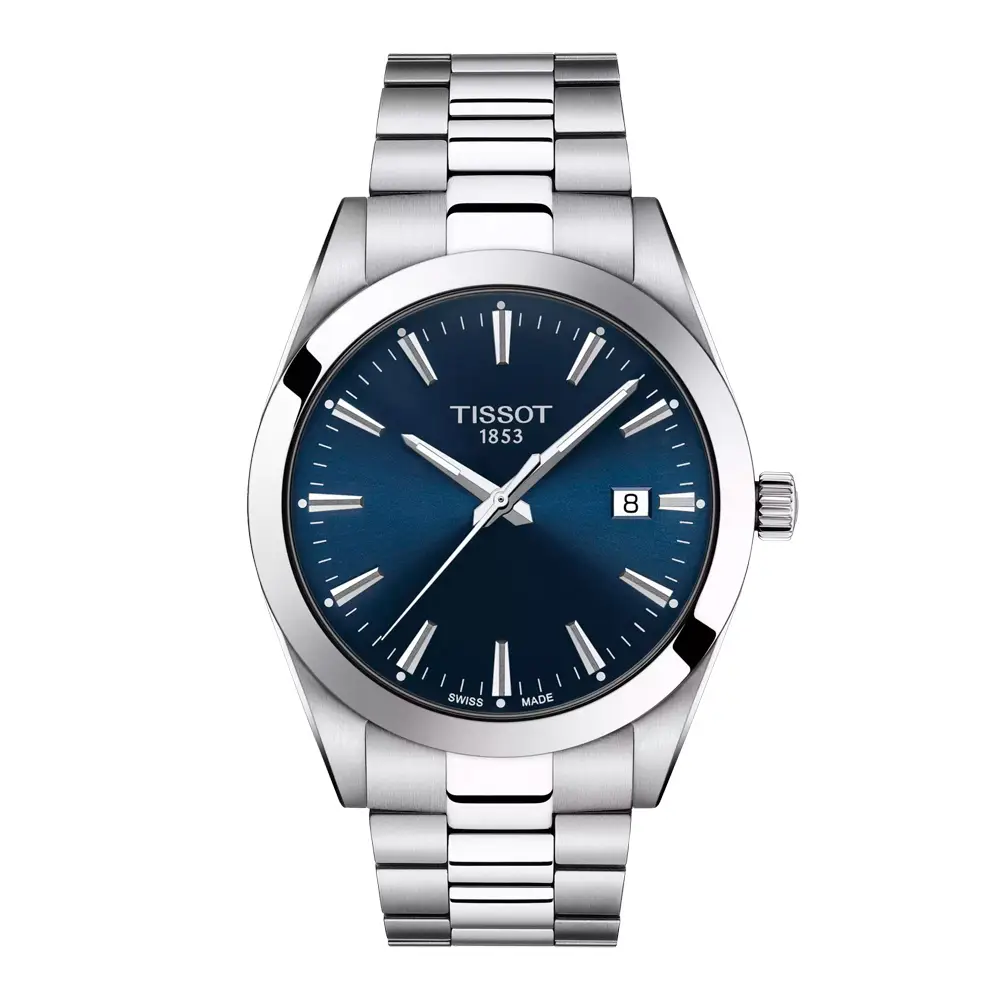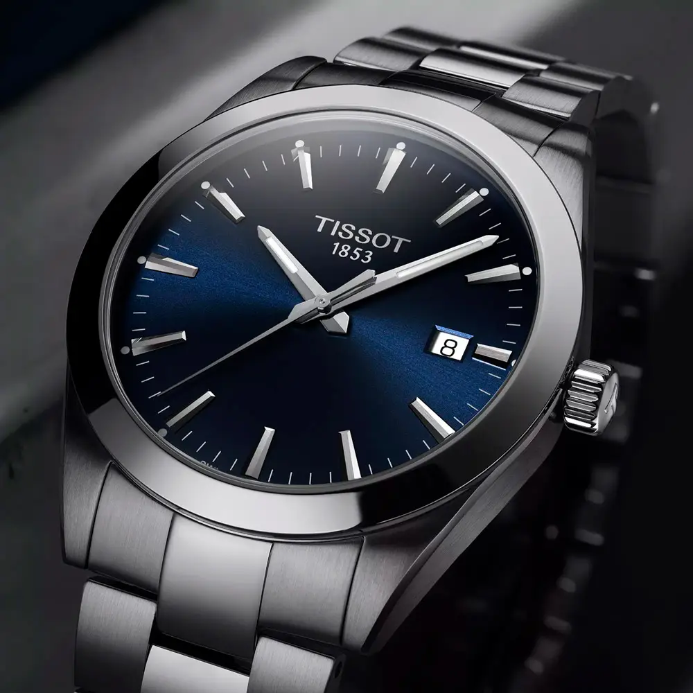 Tissot Gentleman T127.410.11.041.00 combines classic elegance, modern functionality, and Swiss precision. Its 40 mm stainless-steel case is paired with a blue dial featuring polished indexes and hands, highlighting the watch’s timeless character. A date window at 3 o’clock adds everyday practicality.