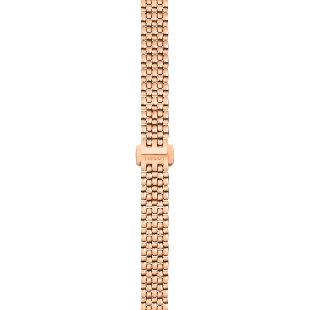 The Tissot Lovely T058.009.33.111.00 from the “Lovely 19.5 mm” collection delivers an exquisite jewelry-like presence thanks to its compact 19.5 mm case diameter. Both the case and integrated bracelet are crafted from 316L stainless steel with a rose-gold PVD coating, giving the watch a refined and luxurious appearance. The natural mother-of-pearl dial adds subtle iridescence, making every piece visually unique.