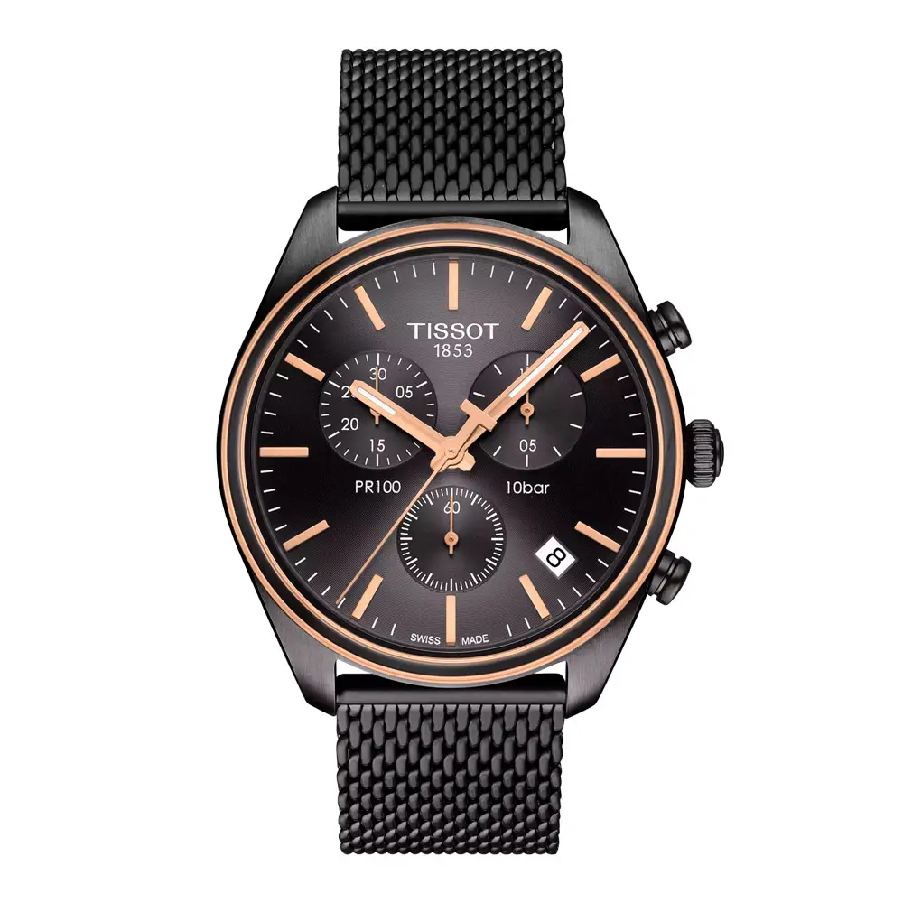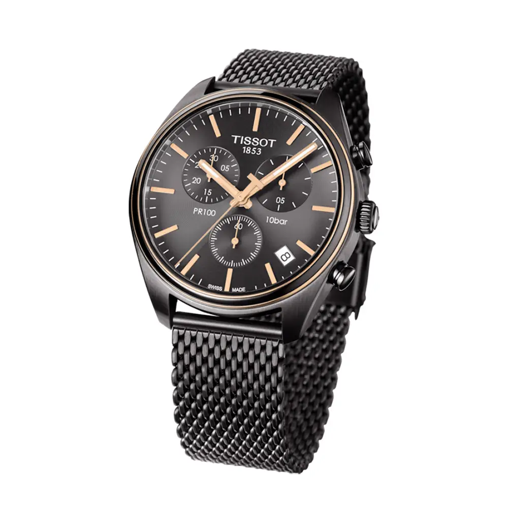 Tissot PR 100 Chronograph T101.417.23.061.00 blends elegance, sportiness, and Swiss precision. Its 41 mm stainless-steel case features a grey dial with rose-gold details, three chronograph subdials, and a date display at 4 o’clock, creating a modern and balanced aesthetic.
