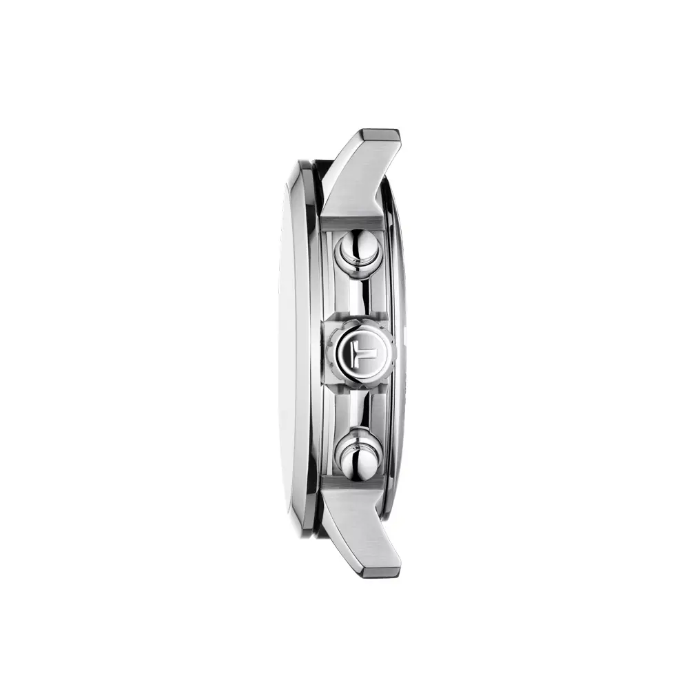 The stainless-steel bracelet with folding clasp matches the case beautifully and offers a secure fit on the wrist. With water resistance up to 200 metres (20 bar), the Tissot PRC 200 Chronograph is perfect for an active lifestyle — from the office to sports adventures.