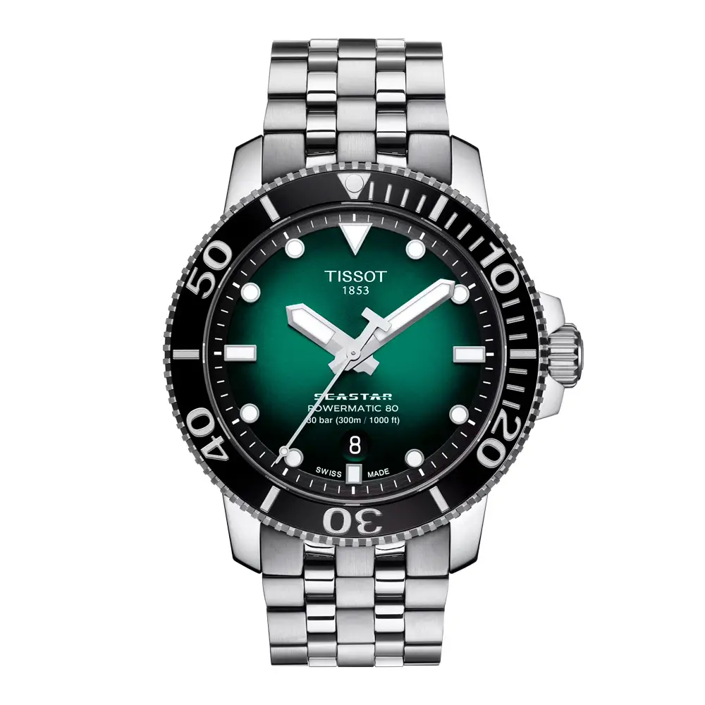 The Tissot Seastar 1000 Powermatic 80 is a men's automatic watch designed for water sports enthusiasts and lovers of elegant style. It features a 43 mm stainless steel case, a green gradient dial with luminous hands and indexes, and a unidirectional ceramic bezel. Thanks to the screw-down crown and 300 m water resistance, it's ideal for diving and demanding conditions.