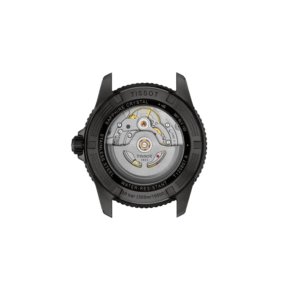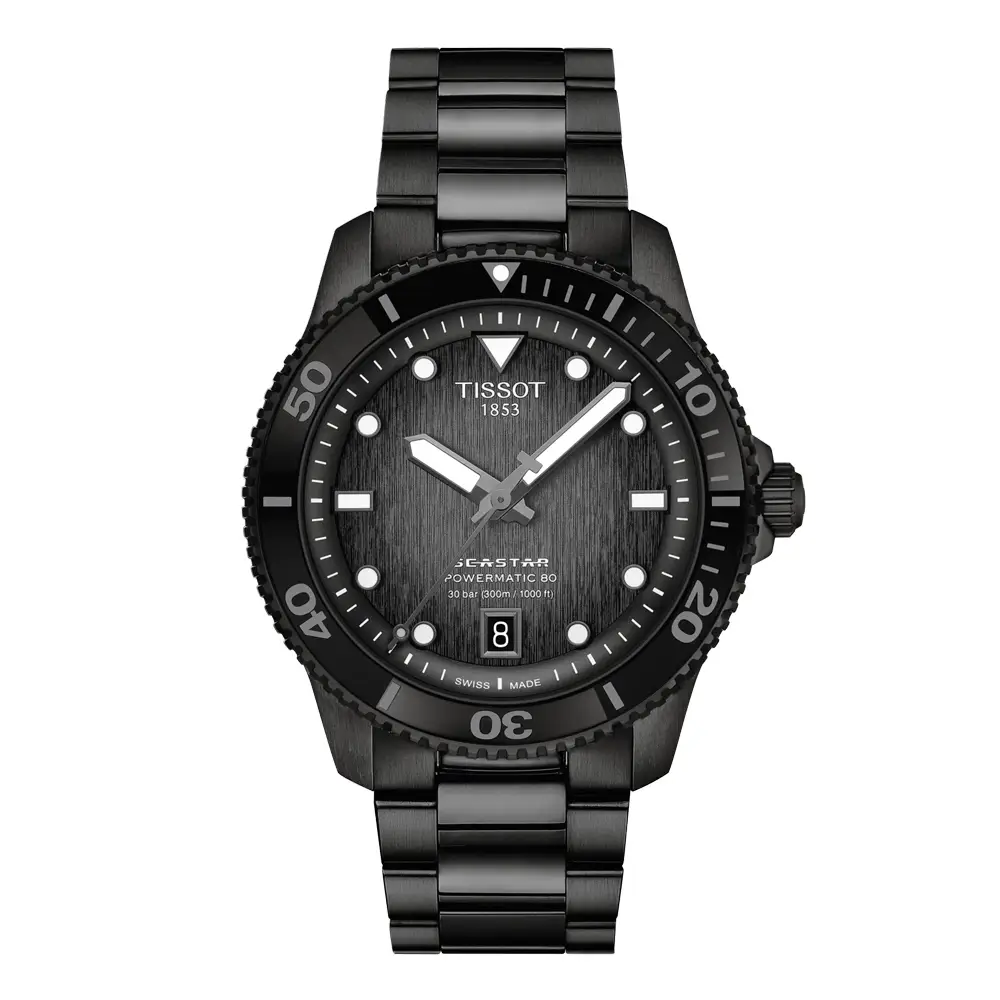 The Tissot Seastar 1000 Powermatic 80 T120.807.33.051.00 blends modern sportiness with impressive durability. Its 40 mm black PVD-coated steel case and luminous anthracite dial (Super-LumiNova®) ensure strong visibility and a bold underwater aesthetic. The unidirectional bezel reinforces its professional diving character.