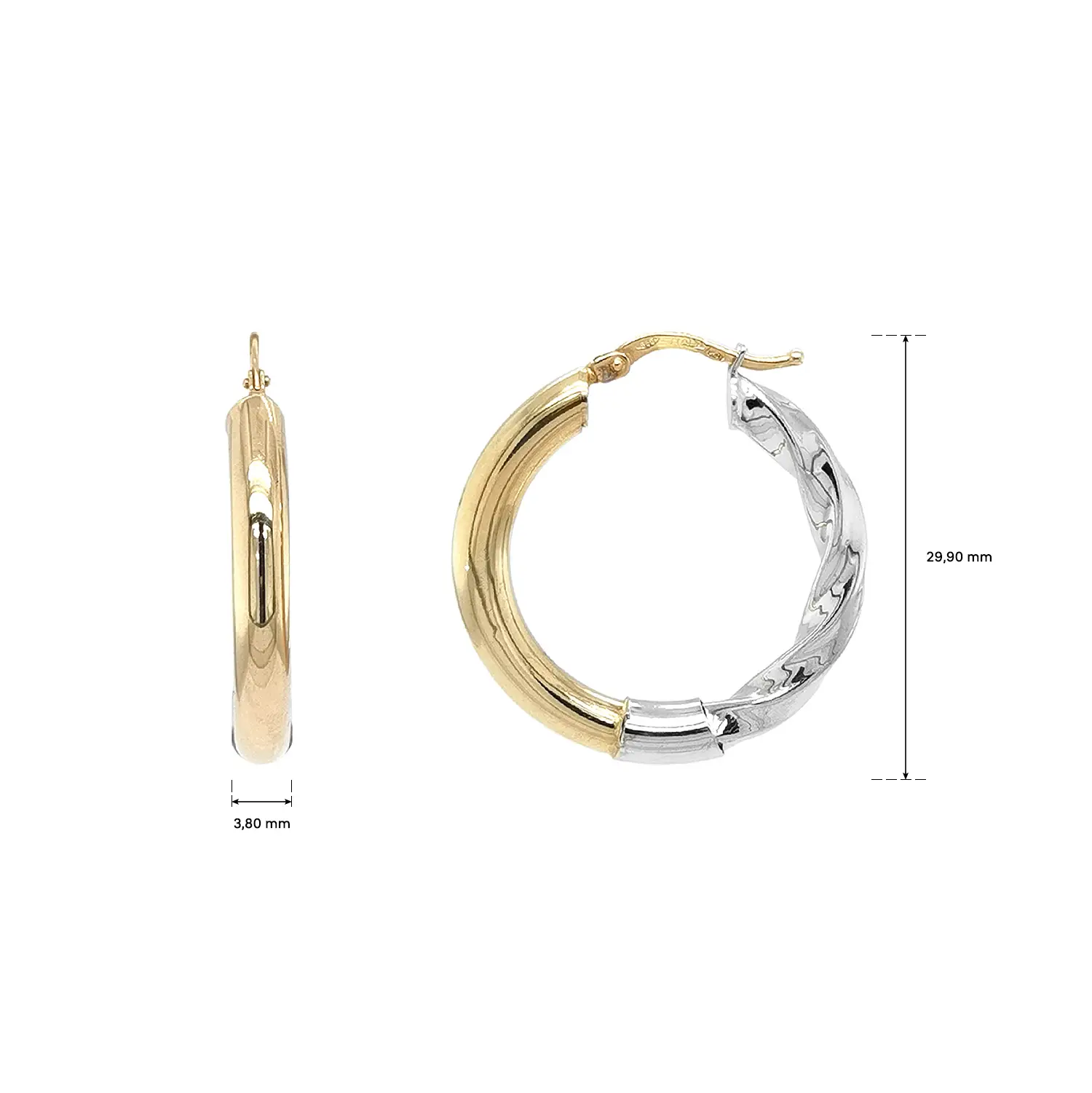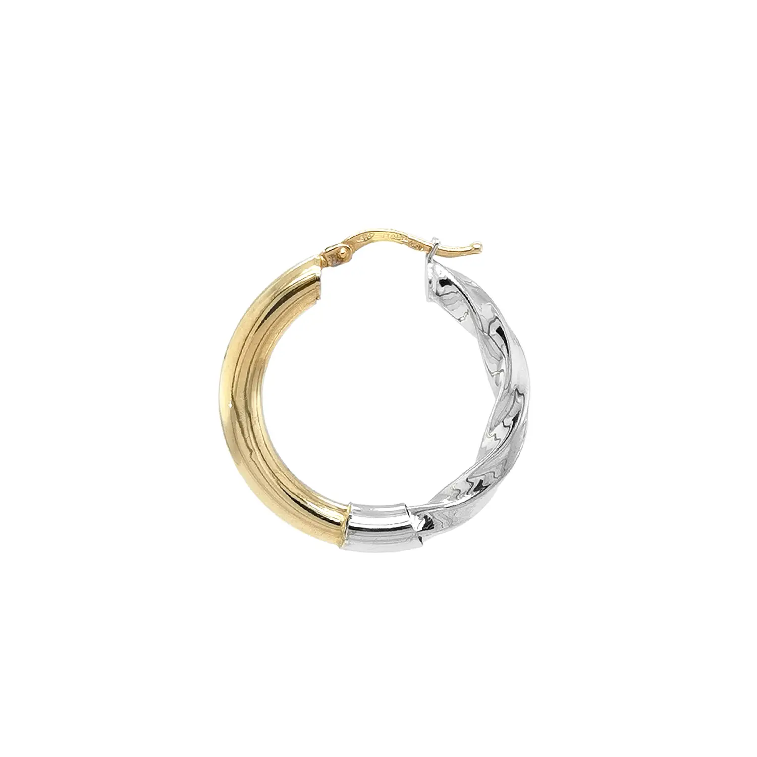 These elegant hoop earrings combine yellow and white gold, creating a stylish contrast between the smooth high-polish front and the twisted design at the back. The yellow gold offers classic warmth, while the white gold with its wave-like twisting adds a refined modern touch.