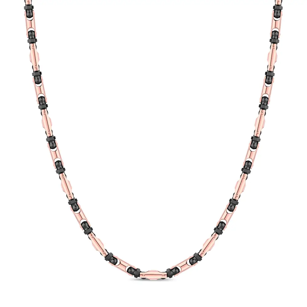 This exclusive Zancan necklace from the Ceramikgold line combines 18K rose gold with black high-tech ceramic, creating a refined contrast and a bold contemporary aesthetic. Each link is precisely crafted and enhanced with ceramic elements, giving the piece a dynamic and sophisticated character. At 60 cm in length, the necklace showcases the clean lines and technical artistry typical of Zancan.