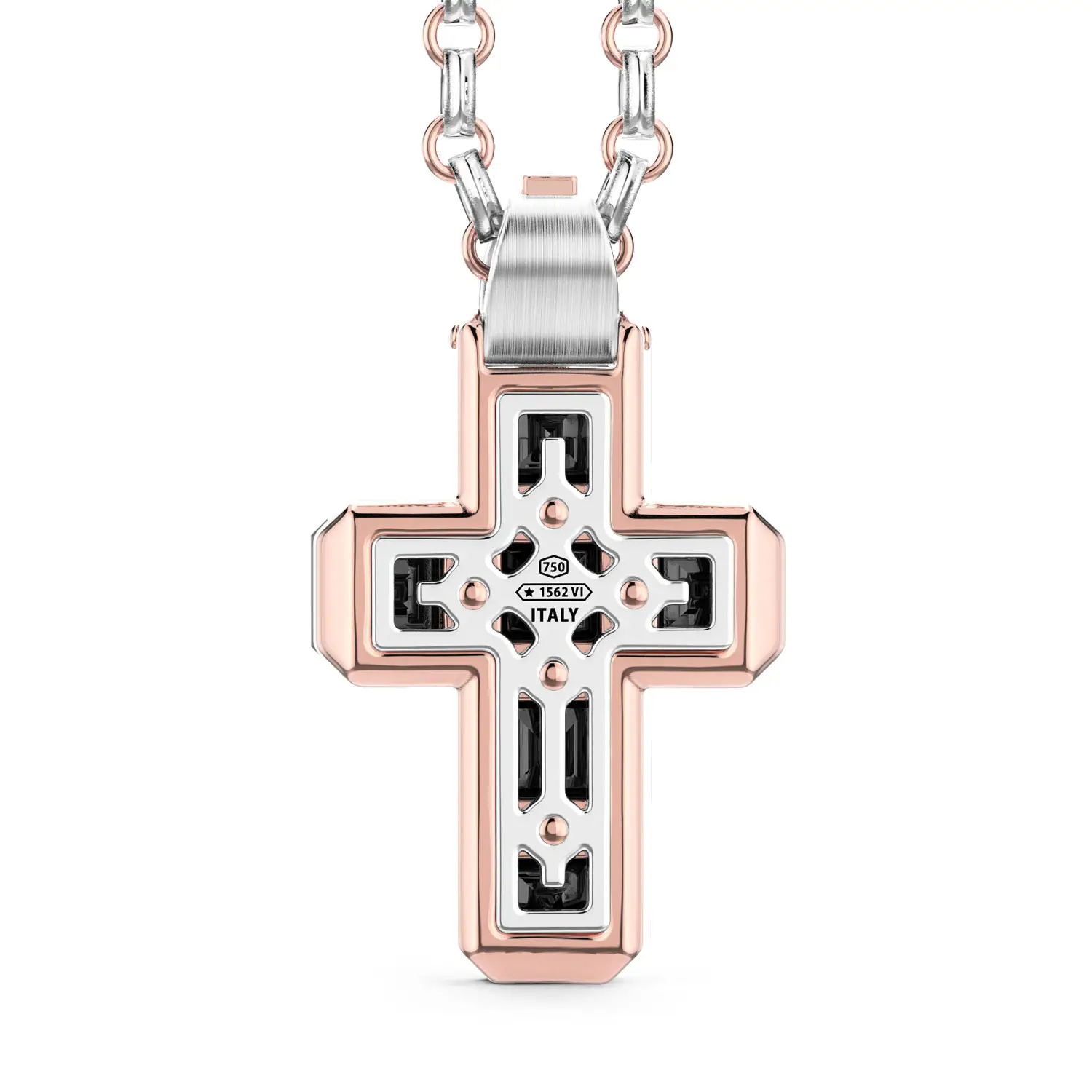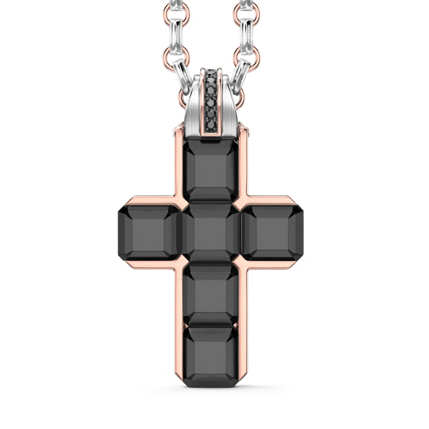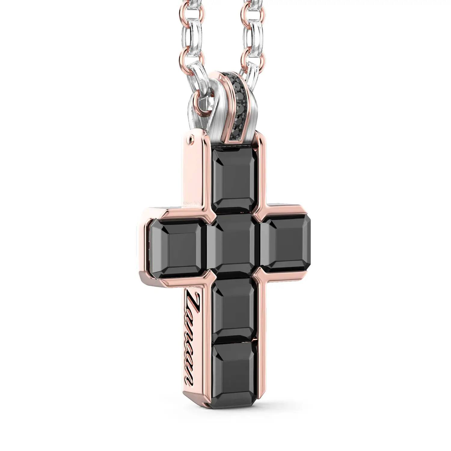 The exceptional Zancan Couture Black Diamond Cross necklace stands out with a bold aesthetic that unites modern design and masterful Italian craftsmanship. The cross-shaped pendant, crafted from a combination of 18K rose and white gold, is adorned with an impressive 10.59 ct of black diamonds, whose deep, mysterious brilliance gives the piece strength, character, and an unmistakable visual impact. The geometric arrangement of the stones creates perfect symmetry, while subtle white diamond accents enhance the overall brightness and depth of the composition.