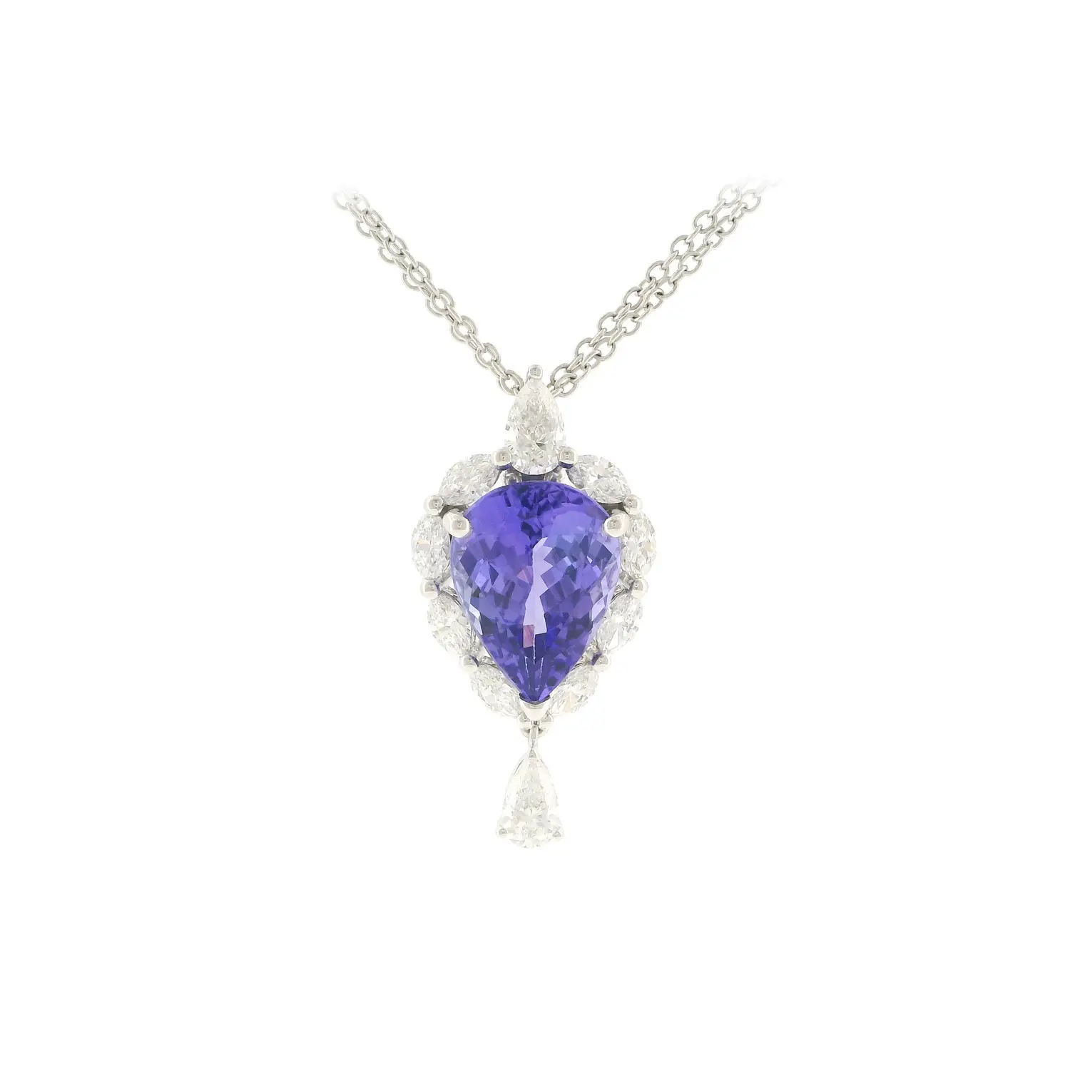 Tento exkluzivní náhrdelník z bílého zlata okouzlí výraznou elegancí a harmonickou kombinací barevného drahokamu a zářivých diamantů. Dominantou šperku je přírodní tanzanit o hmotnosti 4,93 ct, který vyniká intenzivním modrofialovým odstínem a podmanivou hrou světla. Precizní zasazení podtrhuje jeho kapkový tvar a umožňuje kameni plně rozvinout jeho brilanci i hloubku barvy.