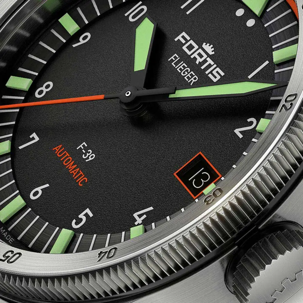 Matně černý ciferník s výraznými ručkami a indexy potaženými Super-LumiNova® X1 zajišťuje perfektní čitelnost ve dne i v noci. Nechybí otočná 12hodinová luneta pro sledování druhé časové zóny a výrazná Synchroline®, která pomáhá při přesné časové synchronizaci – detaily, které odkazují na pravé pilotní dědictví značky Fortis.