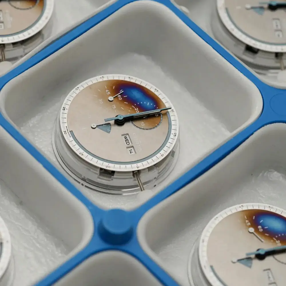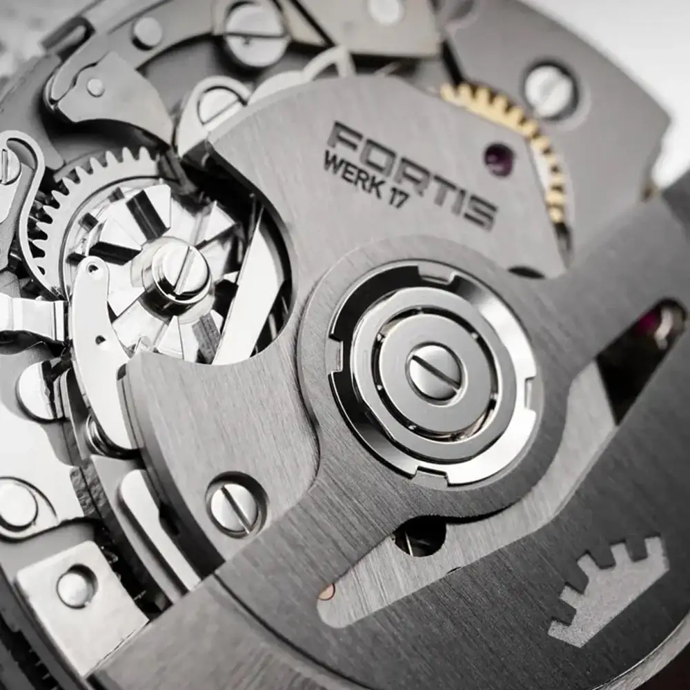 Uvnitř pracuje manufakturní kalibr Fortis WERK 17 s rezervou chodu až 60 hodin. Strojek je vybaven column-wheel chronografem, funkcemi den a datum, malou vteřinou a hacking funkcí. Ciferník chrání safírové sklíčko s antireflexní úpravou a průhledné dýnko umožňuje pohled na mechaniku.