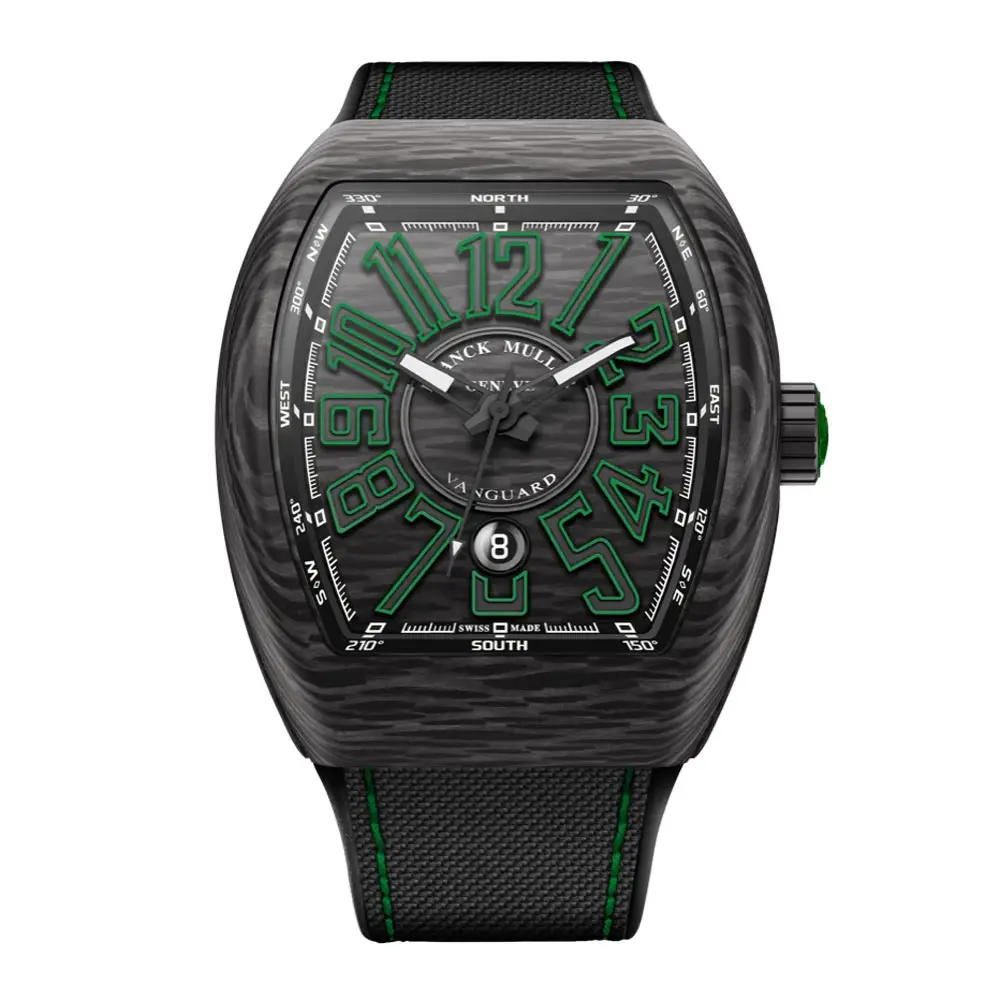 Franck Muller Vanguard se odlišuje svým sportovním charakterem a ikonickým tonneau tvarem pouzdra. Model V 45 SC DT CARBONE NR (VR) zaujme pouzdrem z aerospace grade karbonu, složeného ze 150 vrstev komprimovaných uhlíkových vláken. Černě kartáčovaný povrch doplňují tmavě zelené boční vložky, které barevně ladí s číslicemi na číselníku i se stehem na řemínku.