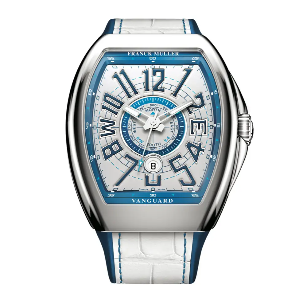 Kolekce Vanguard Mariner propojuje hodinářské řemeslo Franck Muller s navigačními a kompasovými motivy, které vytvářejí technicky čistý a světelně zajímavý vizuální jazyk. Varianta V 45 YT SC DT MAR (AC) staví do centra pozornosti světlý guilloché ciferník se stylizovanou kompasovou růžicí, doplněný o aplikované číslice v modrém tónu. Barevnost působí svěže, sofistikovaně a současně velmi čitelně.