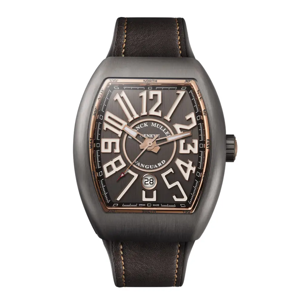 Model Vanguard V 45 SC DT BR (5N) představuje elegantní interpretaci sportovního tonneau tvaru Franck Muller s netradičně teplou paletou odstínů. Hnědý guilloché ciferník s aplikovanými číslovkami v 5N růžovém zlatu vytváří rafinovaný kontrast, který posouvá Vanguard blíže ke společenskému stylu. Celek doplňuje hnědý alligátor strap se sladěným prošitím, vyvažující sportovní tvar pouzdra i jeho materiálové provedení.