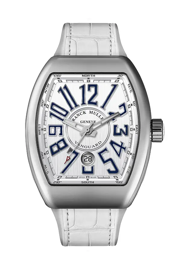 Spojení bílé a stříbrné barvy, které nabízí pánské sportovní hodinky z modelové řady Vanguard značky Frank Muller, působí jemně a zároveň důrazně. Pod ochranou pevného safírového sklíčka se ukrývá hranatý ciferník, jehož dominantními prvky jsou výrazný analogový číselník a datumovka. Na ruku se hodinky připínají bílým řemínkem z kůže a kaučuku.