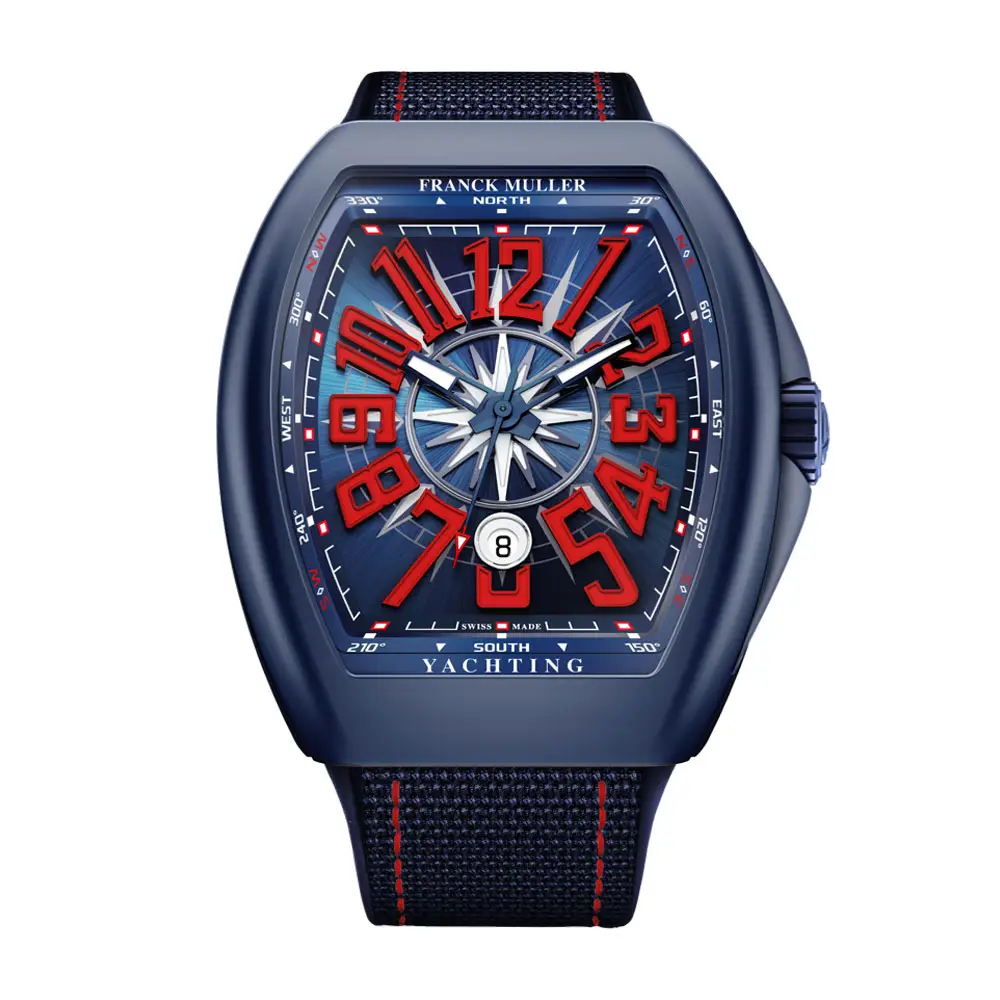 Kolekce Vanguard Yachting rozvíjí estetiku Franck Muller skrze námořní inspiraci a práci s orientačními prvky. Model V 45 SC DT YACHT CR BL MC (BL) staví do popředí modrý ciferník s kompasovou růžicí, který doplňují výrazné červené aplikované číslice. Kontrastní barevnost posiluje vizuální dynamiku a čitelnost, zatímco typická vanguardová typografie podtrhuje identitu modelu.