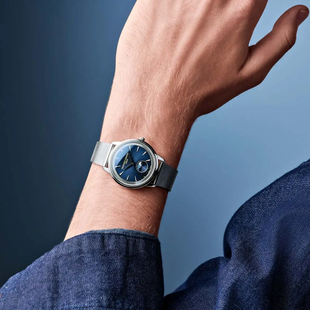 Hodinky Frederique Constant Classics Moneta Moonphase FC-206N3S6B představují esenci klasické švýcarské elegance v moderním pojetí. Modrý číselník se slunečním efektem působí klidným a sofistikovaným dojmem, který podtrhuje ukazatel měsíční fáze na pozici 6. hodiny. Čisté linie, jemné indexy a vyvážené proporce dodávají tomuto modelu nadčasový charakter vhodný pro každodenní i společenské nošení.