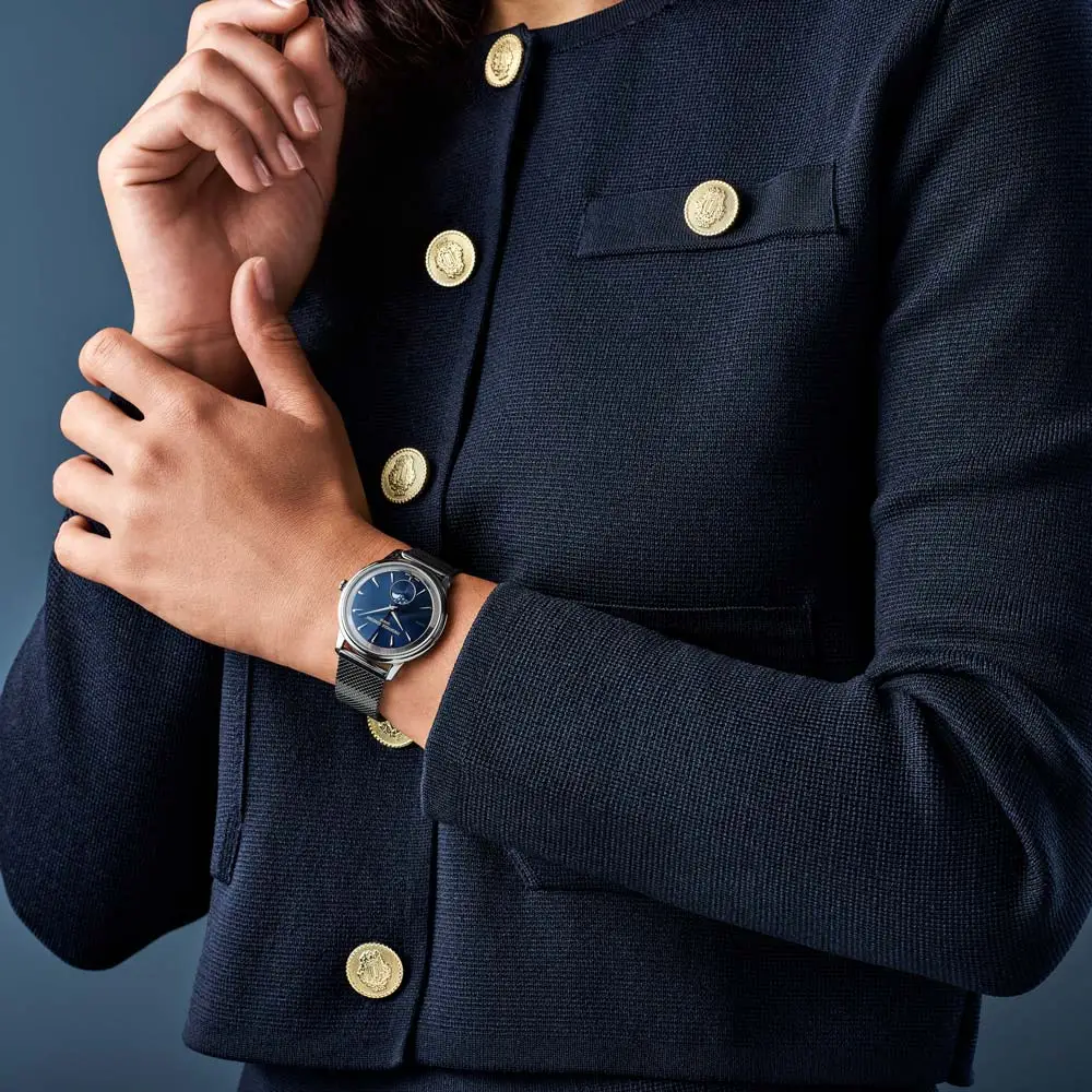 Pouzdro z nerezové oceli o průměru 37 mm je elegantně tenké a perfektně sedí na zápěstí. Safírové sklíčko s antireflexní úpravou zajišťuje vysokou odolnost proti poškrábání a výbornou čitelnost za všech světelných podmínek. Hodinky jsou osazeny ocelovým milánským tahem, který kombinuje komfort, flexibilitu a vytříbený vzhled.
