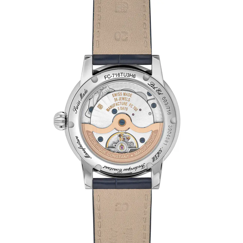 Uvnitř pouzdra tiká švýcarský manufakturní automatický strojek FC-716 s přibližně 72hodinovou rezervou chodu, který nabízí spolehlivý a kultivovaný chod bez kompromisů. Hodinky jsou osazeny modrým aligátořím řemínkem s deployant sponou pro komfortní a bezpečné nošení, zatímco průhledné dýnko umožňuje pohled na pečlivě zdobený mechanismus. Model FC-716TU3H6 je ideální volbou pro náročné muže, kteří oceňují švýcarskou preciznost, uměleckou originalitu a exkluzivní limitovanou edici.