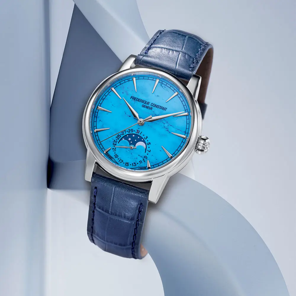 Hodinky Frederique Constant Manufacture Classic Moonphase Date představují vrchol elegantního švýcarského hodinářství s výrazným akcentem na detail a materiály nejvyšší kvality. Pouzdro z nerezové oceli o průměru 40 mm působí nadčasově a precizně, zatímco unikátní tyrkysový ciferník s přirozenými mramorovanými strukturami dělá z každého kusu jedinečný umělecký objekt. Model je navíc limitován na 716 kusů, což podtrhuje jeho exkluzivitu a sběratelskou hodnotu.